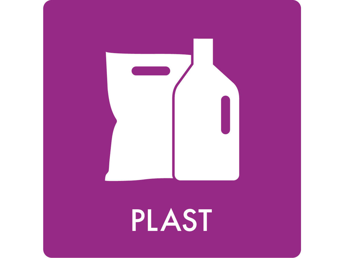 Affaldspiktogram til PLAST i lilla folie til tydelig angivelse af affaldstype ved sortering af affald. Piktogrammet er selvklæbende og kan let klæbes på en affaldsspand eller lign. Det er let at rengøre - tør blot af med en fugtig klud.