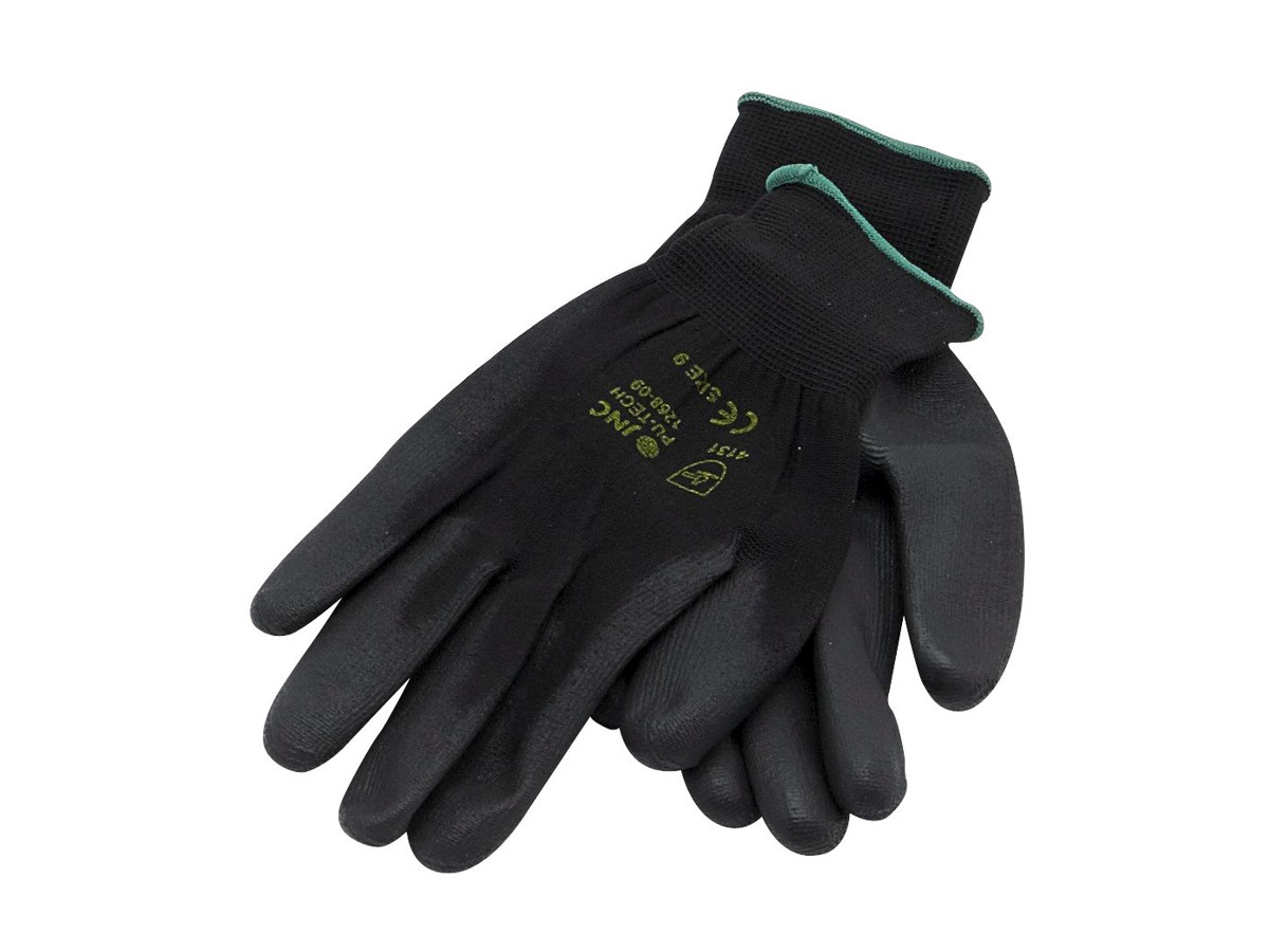 Letvægt arbejdshandske, Velegnet til microfiber-rengøring. Gribefladen er coated med polyurethan således at microfiberne ikke slider eller trænger ind i huden. Håndryggen er ikke coated, for at sikre åndbare egenskaber for hænderne. Sort nylonhandske belagt med polyurethan. Velegnet til arbejde med våde og olierede emner