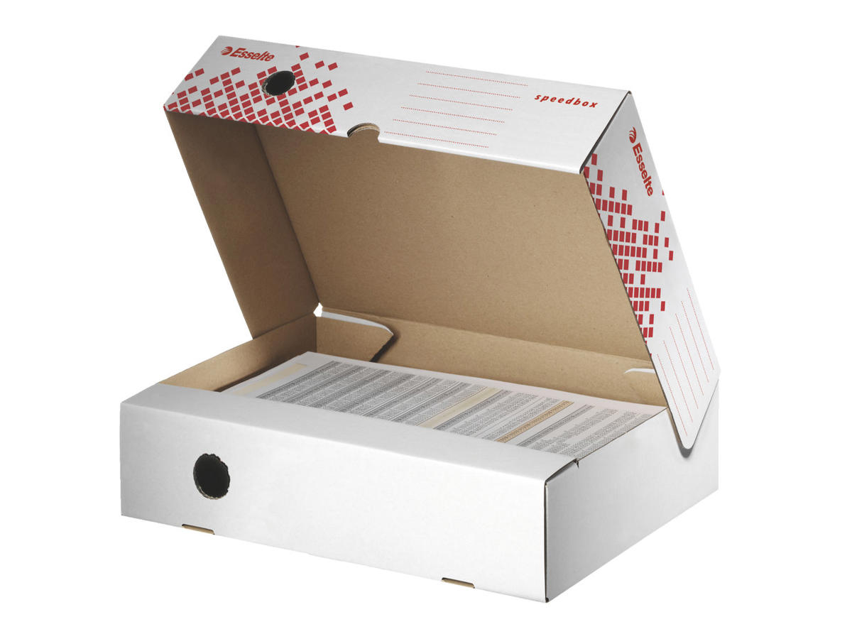 Arkivæske Esselte Speedbox er specielt designet til at maksimere effektiviteten og minimere anstrengelsen i din arkiveringsopgaver. Det unikke design og automatisk samling tillader dig at have dine dokumenter organiseret og klar til arkivering i løbet af ingen tid.