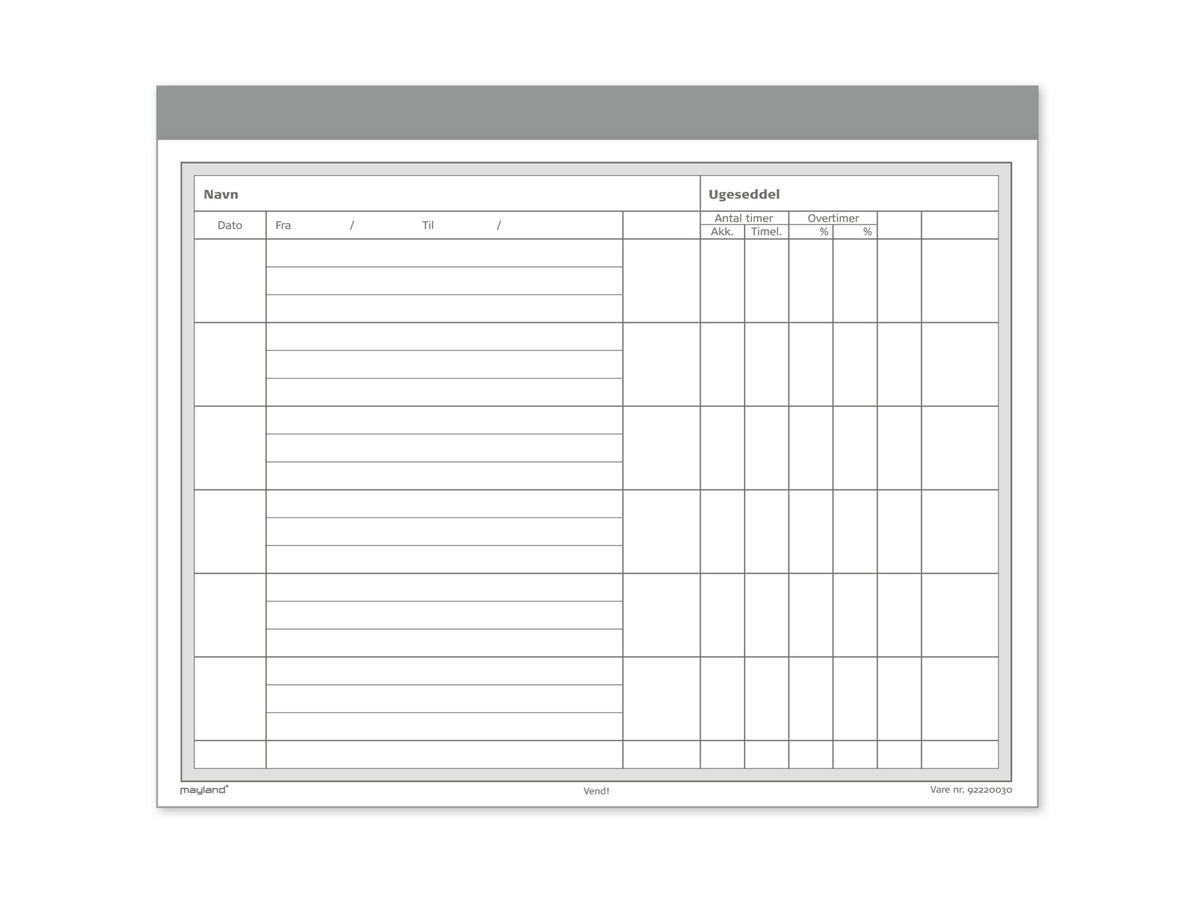Brug ugeseddel blokken til organisering og styr på arbejdsordre og lønsedler. Ugeseddel blokken har indlagt karbonpapir samt felter til opgaver med tilhørende dato, timer og overtimer.