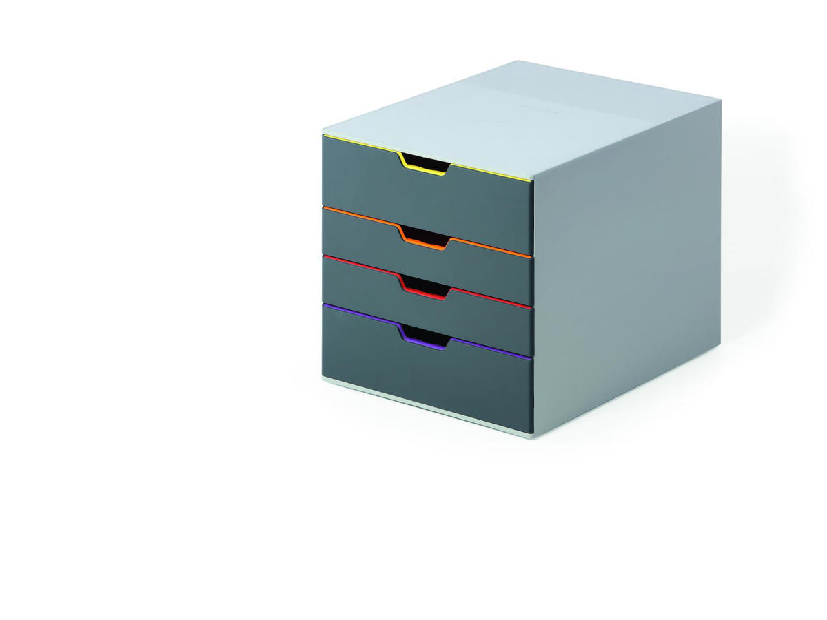 Attraktiv og innovativ skuffeboks med fire farvestrålende skuffer, herunder to i XXL-format, fremstillet af højeste kvalitet. Skufferne i forskellige farver gør det nemt at organisere sine dokumenter. Skufferne er forsynet med udtræksstop, og er nemme at åbne og lukke. Passer til format op til A4, C4 Folio og kuvertstørrelse. Skuffeboksen leveres med transparente etiketter til opmærkning. Udskriftsvenlige etiketter som er nemme at udskifte. Stablebar med skridsikre gummifødder på undersiden. Mål: 292 X 280 X 356 mm (BxHxD).