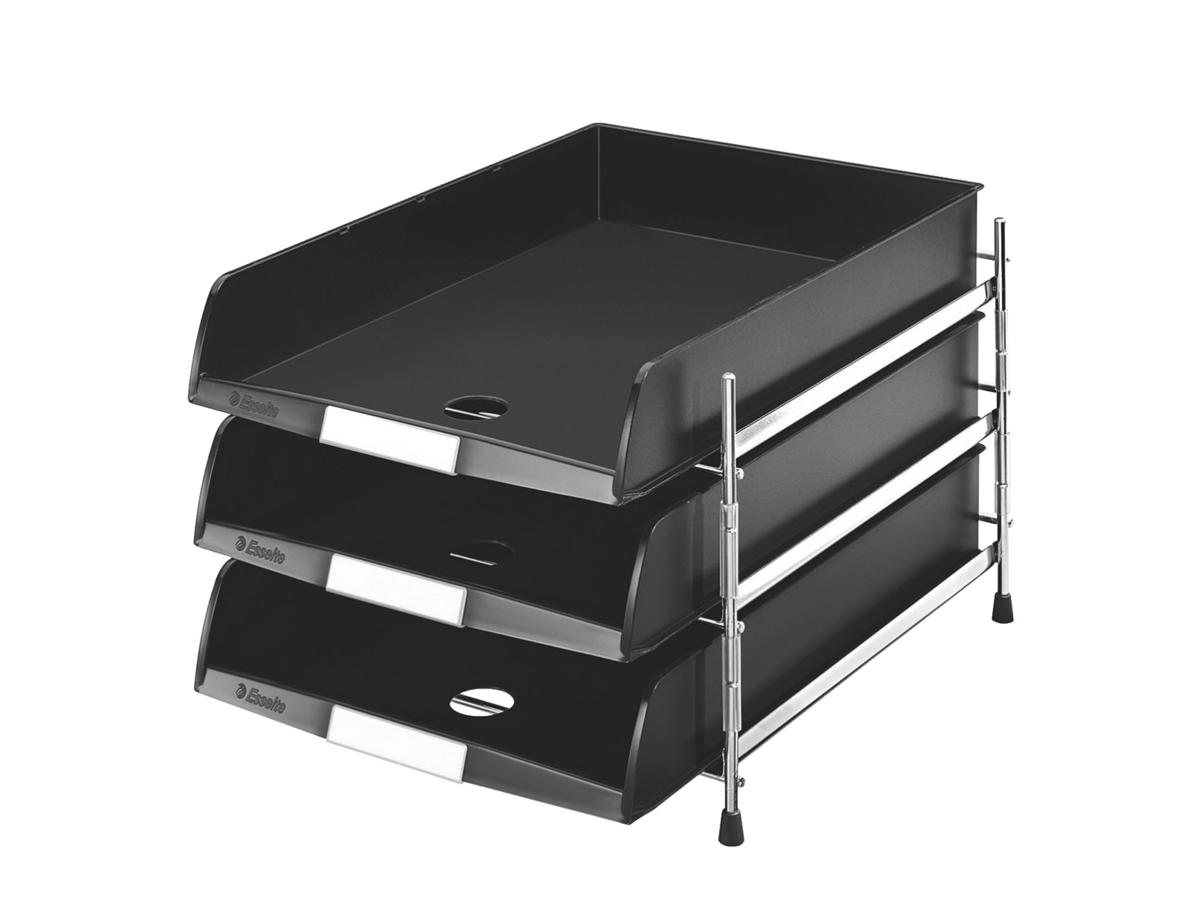 Det er tid til at organisere dit skrivebord med Brevbakkestativ Esselte C4. Dette metalstativ er inkluderet med 3 brevbakker, der vil hjælpe med at holde dine papirer organiseret og let tilgængelige.