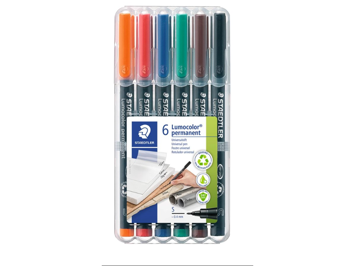 Lumocolor® permanent pen 313 til brug på stort set alle overflader. Velegnet til brug på cd'er / dvd'er samt mærkning på metal, plast, træ samt andre overflader.  Smudsafvisende og vandfast kvalitet. Tørrer på sekunder, derfor ideel til venstrehåndede brugere. Permanent, lugtsvag blæk. Praktisk Stand-Up STAEDTLER box. PP skaft og hætte sikrer lang levetid. Kan ligge uden hætte i dagevis uden udtørring . Flysikker. Superb farve glans. Linjebredde superfine ca. 0.4 mm. Genopfyldelige. Etui med 6 assorterede farver