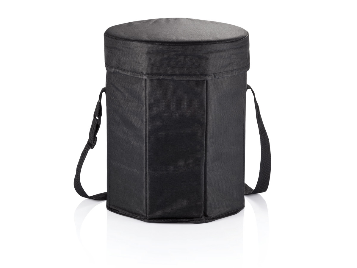 600D polyester i sort med PE-belægning, 30cm i diameter, sammenfoldelig. Kan bruges både som køleenhed og skammel