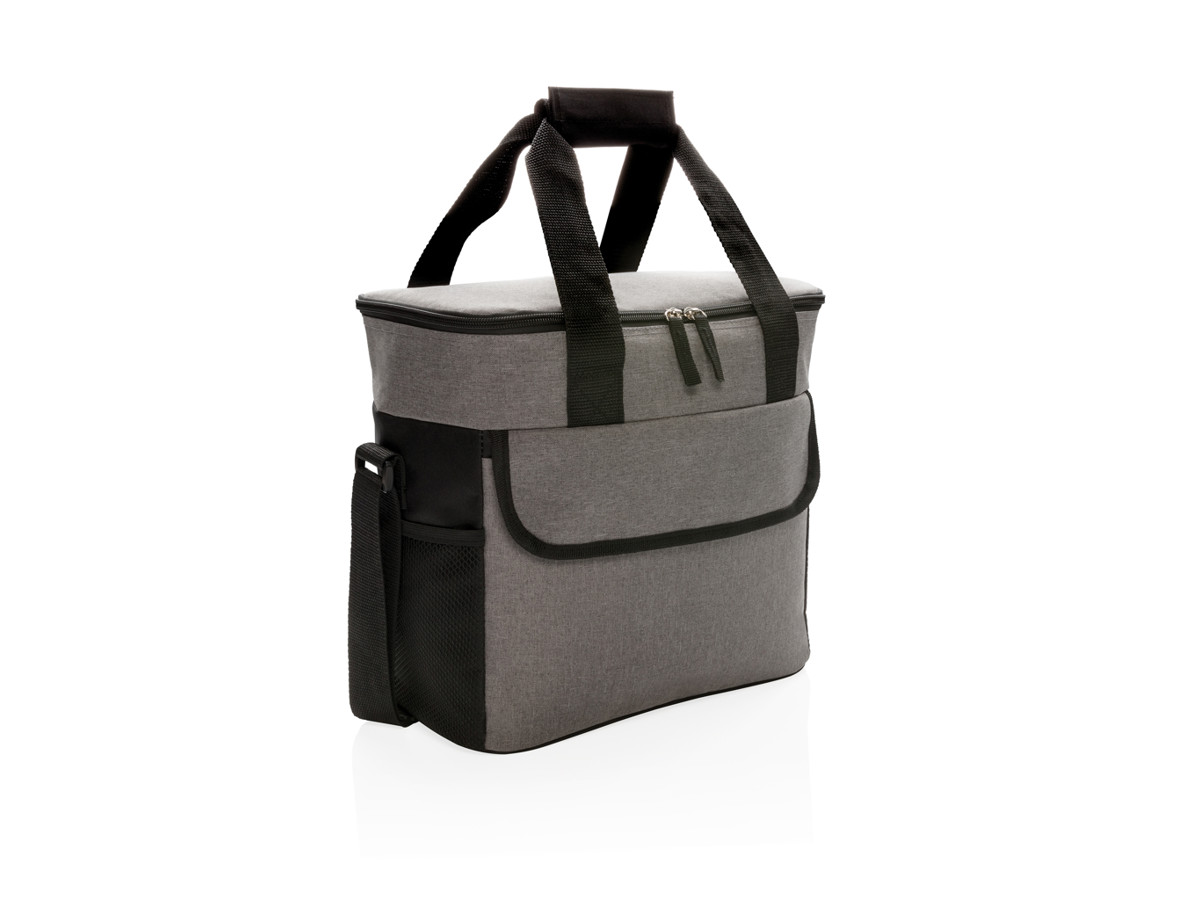 Stor køletaske af 600D polyester i to nuancer kan rumme op til 20 dåser. Med 2 sidelommer af mesh og 1 forlomme.