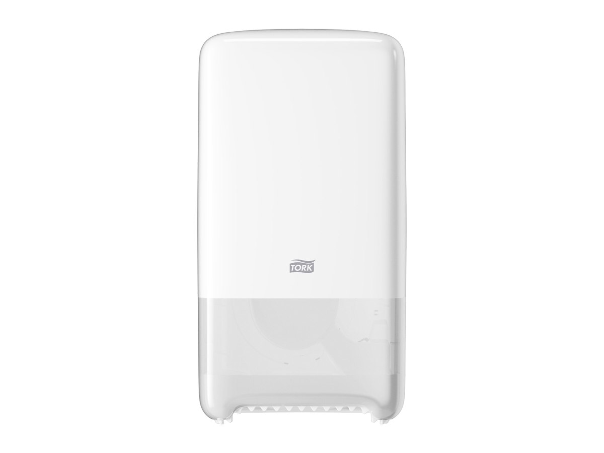 Pæn, praktisk og kompakt dispenser fra Tork til toiletpapir. Den kan indeholde op til seks gange så meget toiletpapir som en standard rulle toiletpapir indeholder. Det mindsker vedligeholdelse og omkostninger, hvilket gør den praktisk til toiletter med en middel til høj brugerfrekvens.