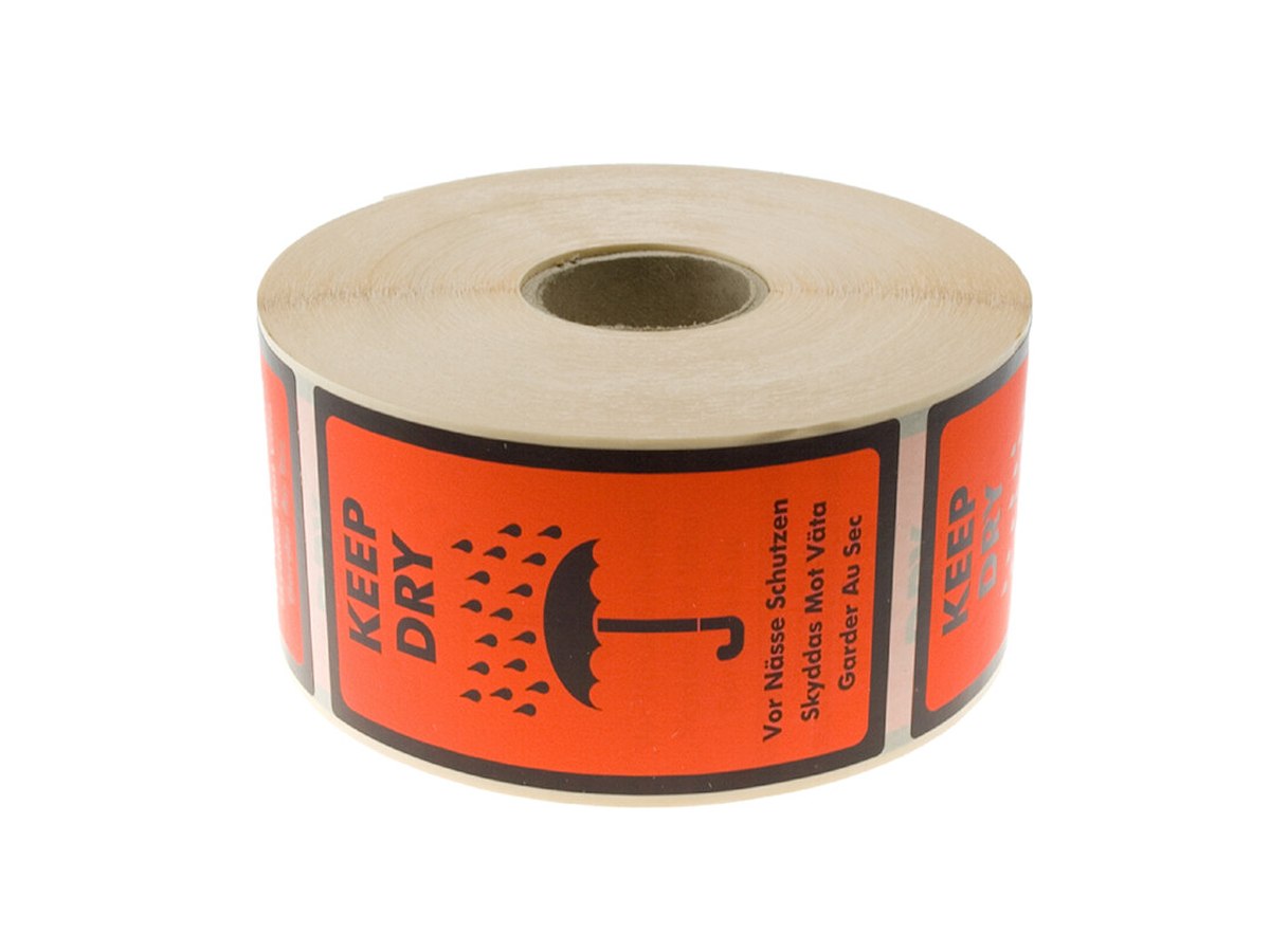 Fluorescerende selvklæbende etiket med sort print: "Keep Dry"