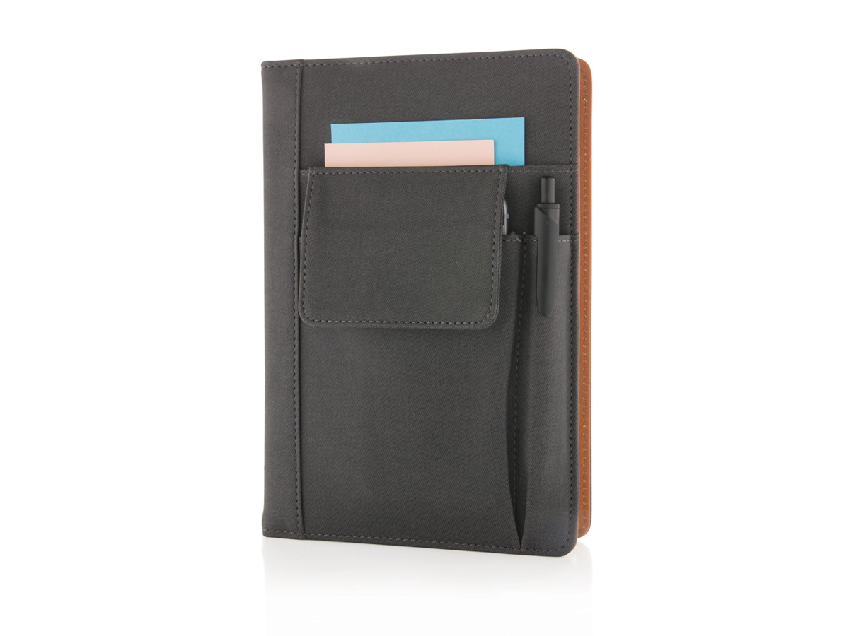 PU-belagt omslag til notesbog med frontlomme til telefon (14 x 10cm), pennelomme og en hovedlomme til eksempelvis powerbank eller visitkort. Sort sidedeler og 160 sider på 80g/m2 indvendig. Dette omslag kan genbruges med ny notesbog refill så har du altid noget at skrive i.