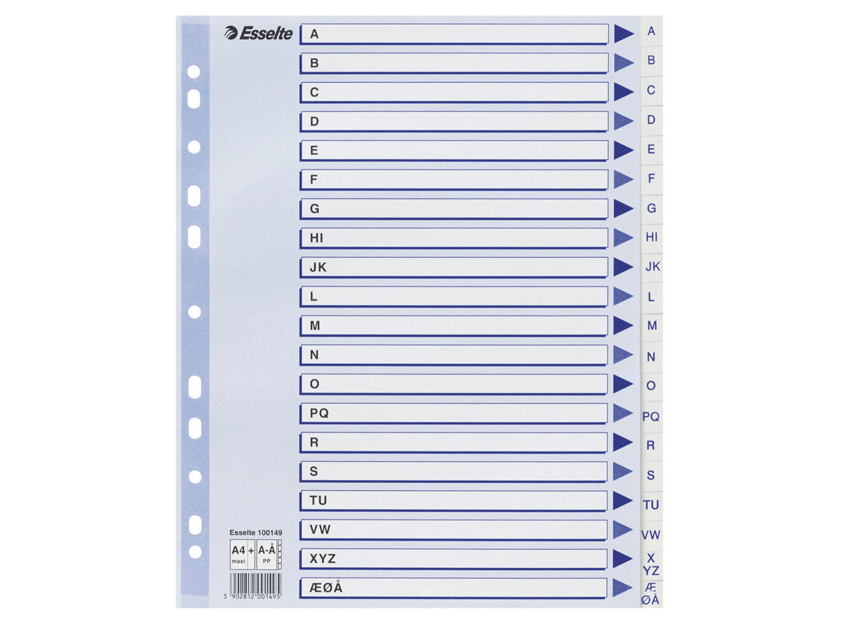 Alfabetiske faner fra A til Å gør det nemt for dig at holde orden i dine dokumenter. Registeret kommer med et forblad med store skriveområder til indhold, hvilket giver et perfekt overblik over dine filer. Med dette Register Esselte PP kan du sige farvel til rodede skuffer og papirer spredt over hele bordet.