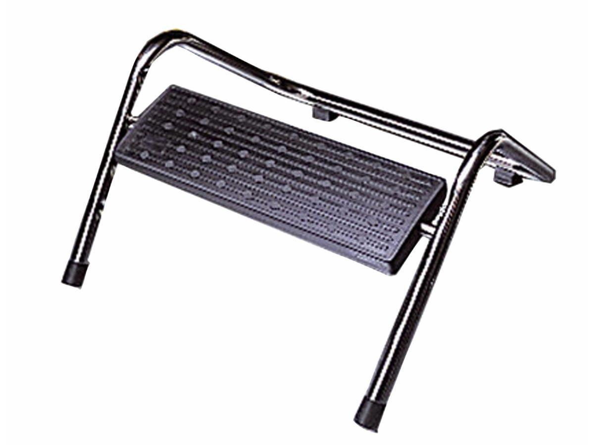 Forkromet stel og skridsikre gummidupper. Fodpladen følger fodstillingen. Er let at indstille i fire højder. Let at flytte med fødderne.
