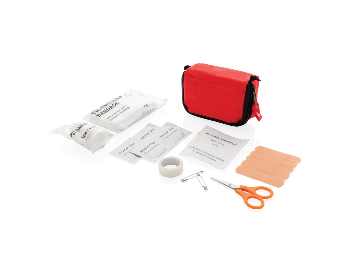 Taske med lomme foran, et rum med sort lynlås og bæltestropper på bagsiden af tasken. Indhold: trekantet bandage, PBT-bandage, spritserviet, plastre, saks, nål og tape. Overholder EN 13485:2003.
