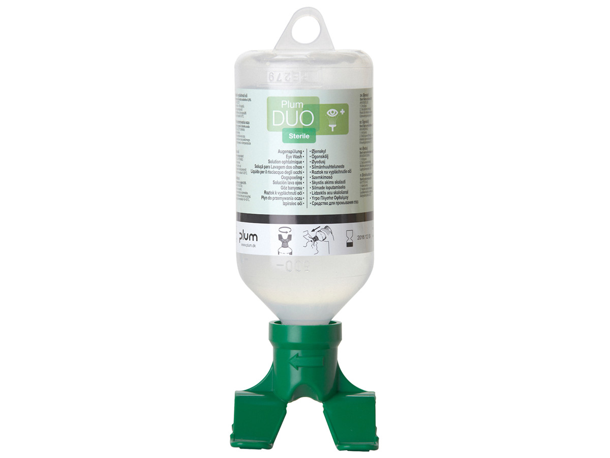 • En let håndterlig flaske med 0,9% steril natriumklorid. Den ergonomiske DUO øjenkop gør det muligt at skylle begge øjne samtidigt. Flasken kan bruges løst eller som genopfyldning i DUO øjenskyllestationer og -bokse. Anbefalet skylletid ca. 2 min.