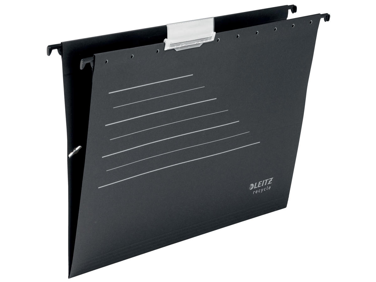Iøjnefaldende hængemappe i premium kvalitet med v-base egnet til A4. 100% genanvendt karton, klimaneutral, 100% genanvendelig og med Blå Engel miljøcertificering. Maksimer lagerpladsen med lodret arkivering for at holde papirer ryddelige og tilgængelige. De stærke holdbare, hængende stænger tåler kraftig anvendelse, og den medfølgende etiketholder hjælper med at organisere og identificere indhold. Denne robuste hængemappe komplementerer perfekt andre produkter fra Leitz Recycle-serien og er lavet til at holde.
