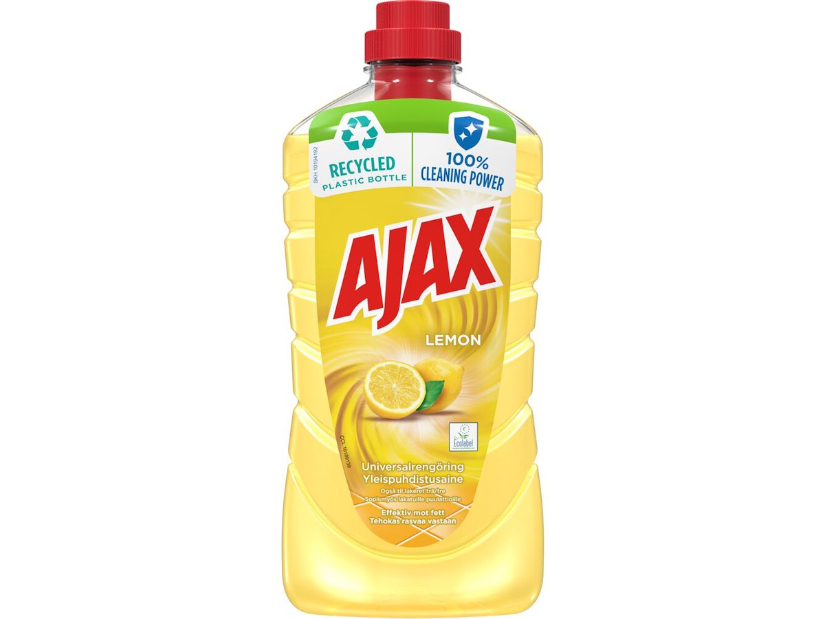 Ajax universal rengøring med effektive aktive ingredienser baseret på planter gør overfladerne i dit hjem skinnende rene uden anstrengelser. Den fjerner snavs og fedt uden at efterlade rester. De æteriske olier fra sicilianske citroner efterlader en dejlig frisk duft af renhed. Doseringsinstruktioner: Middel snavsede gulve: 1 hætte til 8 l vand. Meget snavsede gulve: 4 hætter til 8 l vand.