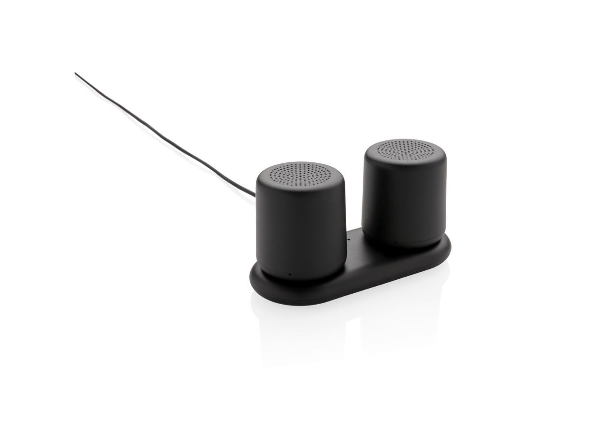 2 x 3W højtalere der kan parres for at danne stereolyd. Placer højtalerne hvor du ønsker for en bedre lydoplevelse. ABS-højtaleren kan oplades ved blot at placere den på opladningsbasen. Ingen behov for at forbinde kabler. Begge højtalere har et 300 mAh batteri der giver op til 2 timers spilletid. BT 4.2 giver en rækkevidde på op til 10 meter. Leveres med 120 cm langt micro USB-kabel til opladningsbasen.