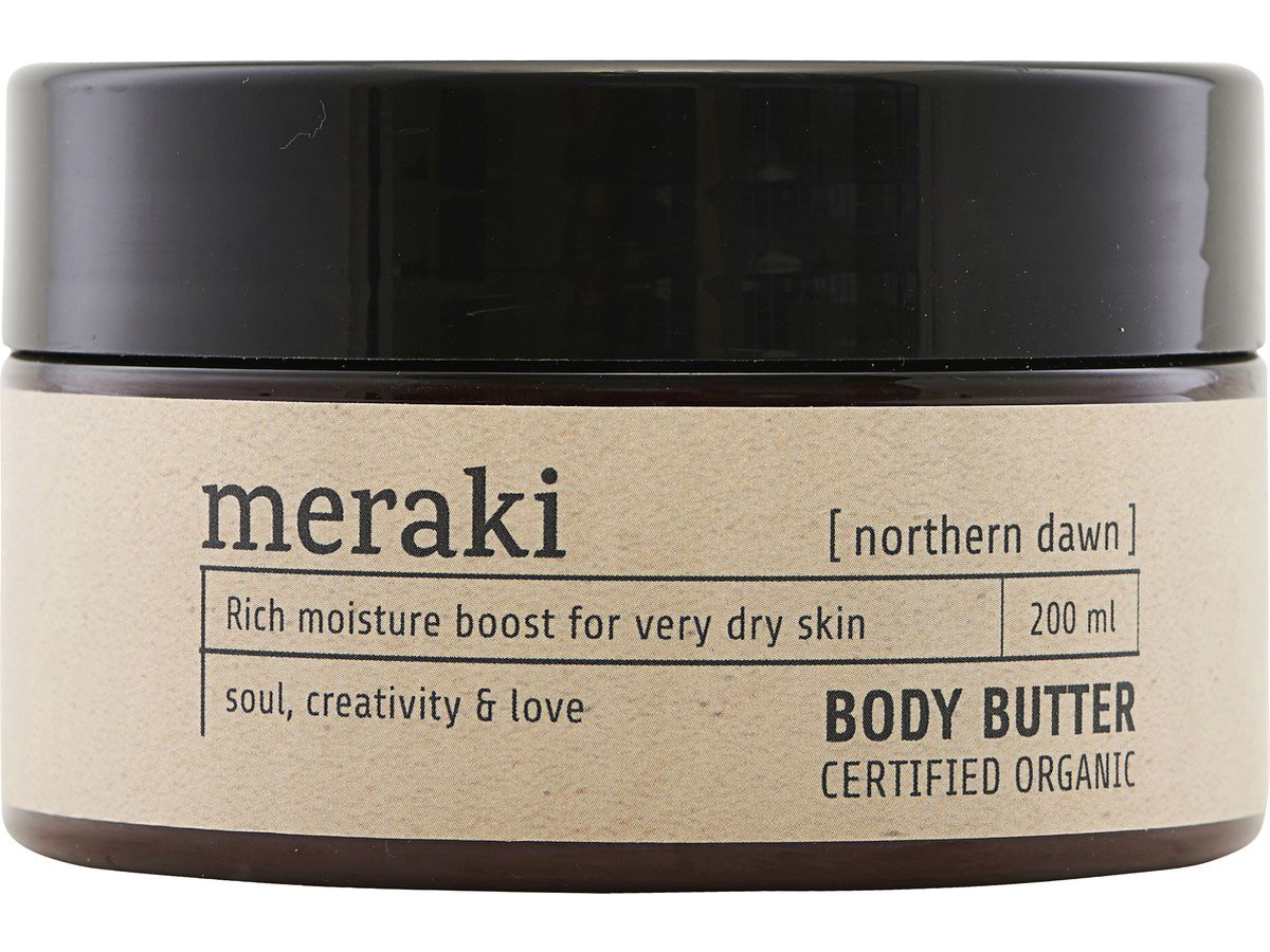 En ekstra nærende og blød body butter fra Meraki, som ikke fedter. Formlen, som hedder Northern Dawn, er rig på økologiske ingredienser som aloe vera, sheabutter og olier fra mandel, solsikke og oliven. Alle modvirker de udtørring og efterlader din hud blød og gennemfugtet. Certificeret COSMOS økologisk af Ecocert. Noter: Frisk appelsin, cedertræ og sød balsamico. Massér cremen blidt ind i huden. Velegnet til daglig brug og til alle hudtyper.