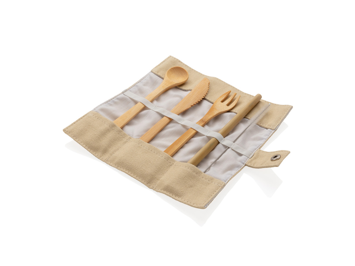 Medbring dit eget genanvendelige bambus bestik uanset hvor du skal hen. Reducer plastik affald og hjælp med at beskytte vores planet. Dette bestik kan også komposteres så de ikke forurener miljøet. Sættet indeholder: ske, gaffel, kniv, sugerør og børste. Flot indpakket i kanvas rejseetui.
