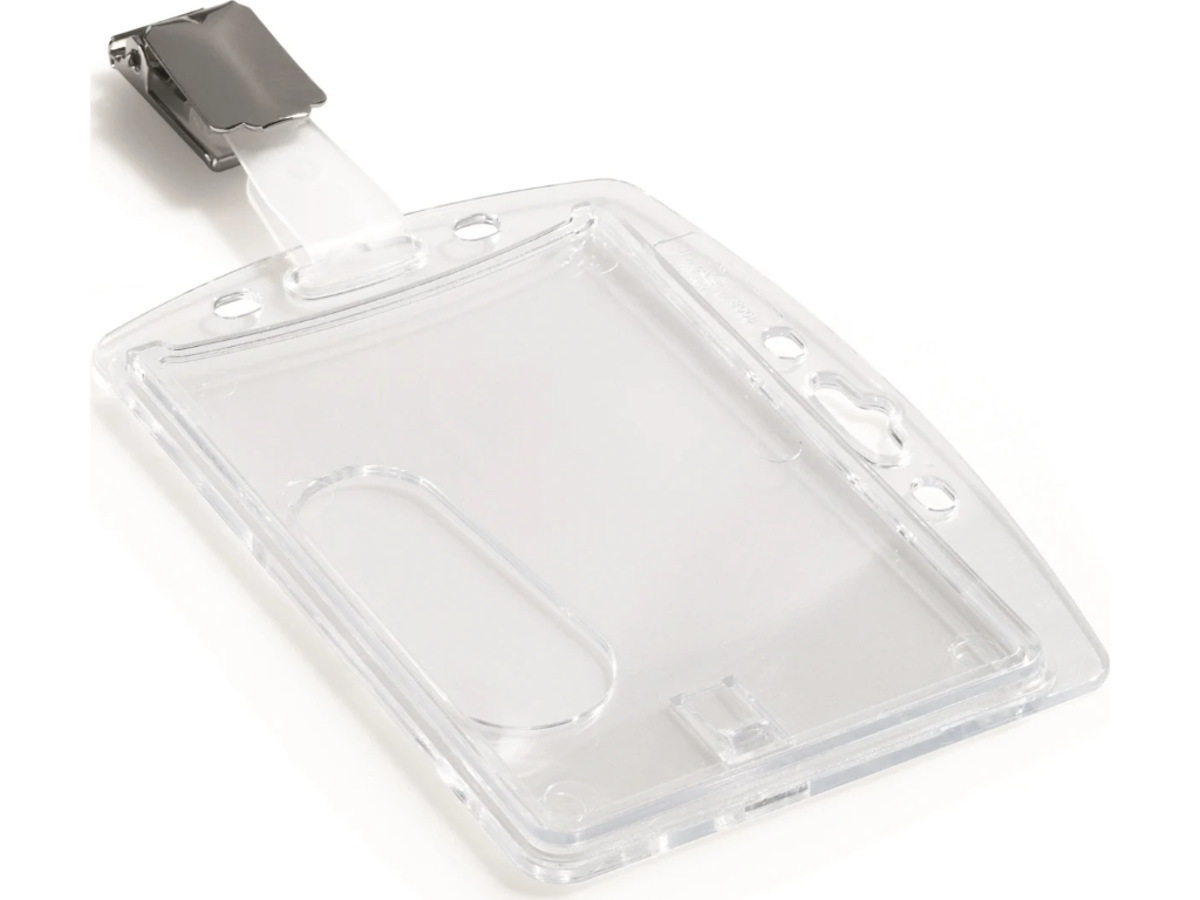 - Adgangskort holder af slidstærkt akryl med drejelig seleklemme.