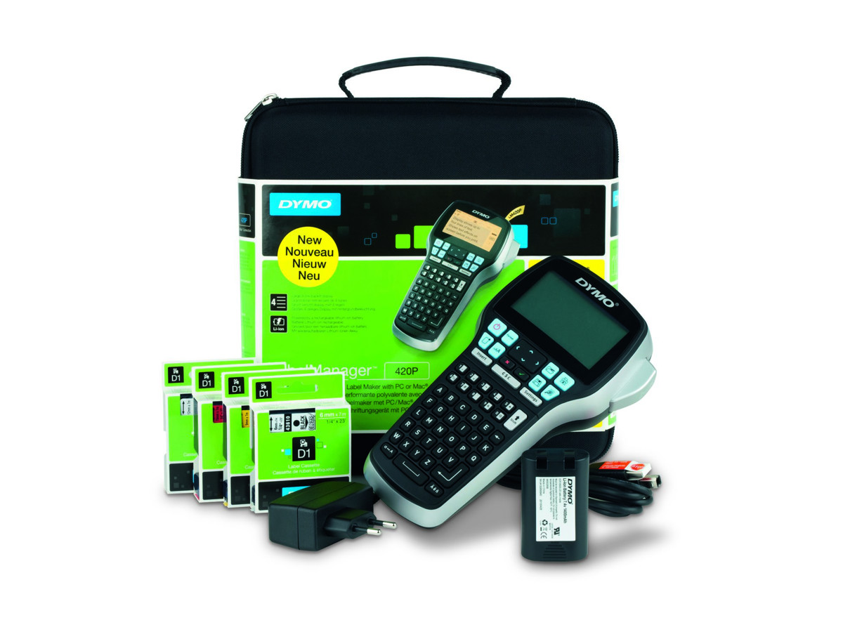 Dymo LabelManager 420P i praktisk kuffert og med strømforsyning, genopladeligt batteri samt 4 stk D1 tape.