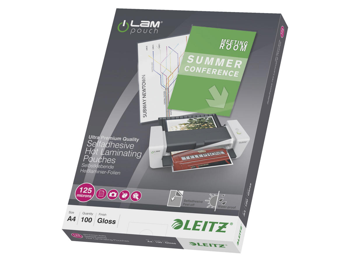 - Leitz iLAM Hot lamineringslommer er selvklæbende A4, 125 mikron, perfekt forsegling til garanteret beskyttelse mod snavs, væske og fugt.