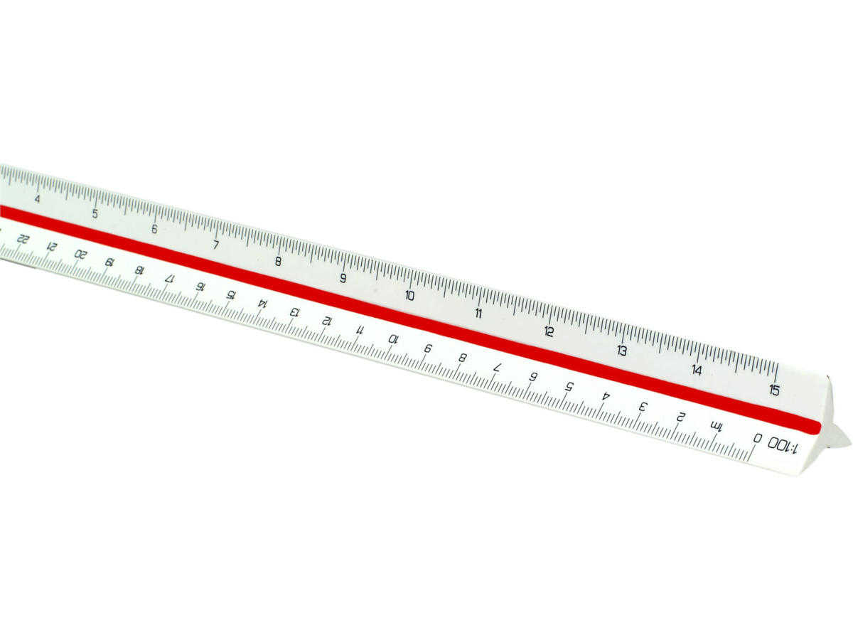Målestokke trekantede. Fremstillet af mat hvid Dunirit. Længde 300 mm. Med 6 forskellige skalaer. Leveres i plastetui.