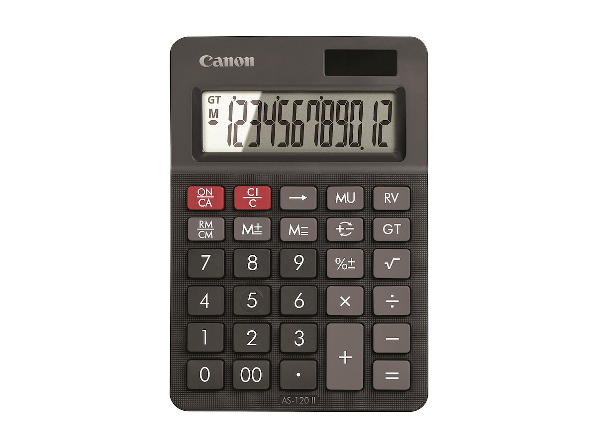 AS-120 er en bordlommeregner med 12-cifret, opretstående og vinklet display, markup- og reversfunktion.