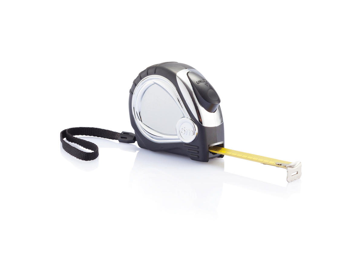 5m/19mm ABS-krombelagt kabinet, blødt gummigreb og gult målebånd. Bælteclips og håndledstrop medfølger.