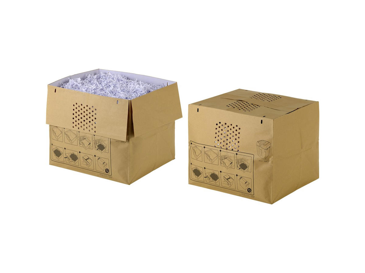 Når sækken er fuld, kan den nemt fjernes fra makuleringsmaskinens tilbagetrækkelige beholder. Med indbyggede selvklæbende strimler er det let at lukke sækken og erstatte den med en ny. Sækken klarer op til 32 liter makuleret materiale, som nemt kan genanvendes.