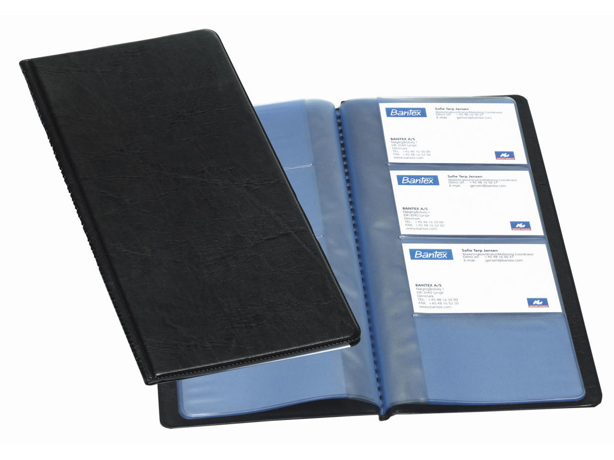 Sort visitkortmappe med plads til 96 visitkort. Kraftige ydersider i stærk plast.
