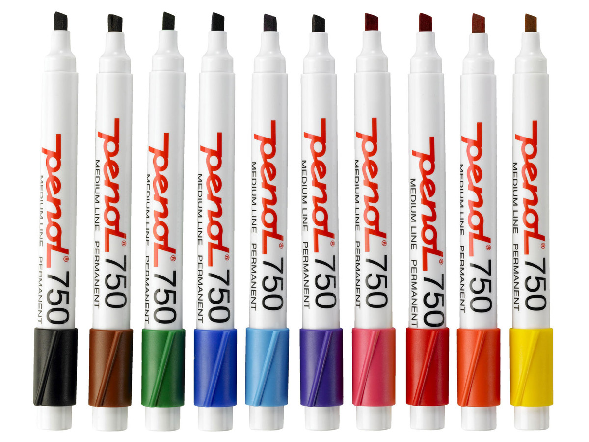 Markeren er med alkoholbaseret permanent blæk, skrå spids og plastbeholder.