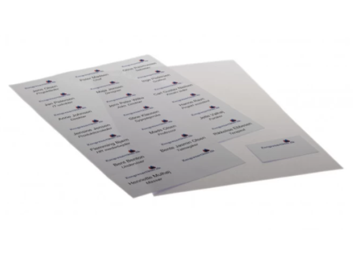 Indstiksark til navneskilte på A4 papir. Velegnet til udskrivning i laser-, inkjet- eller kopimaskiner. Lette at skille ad. 21 ark pr. pk.
