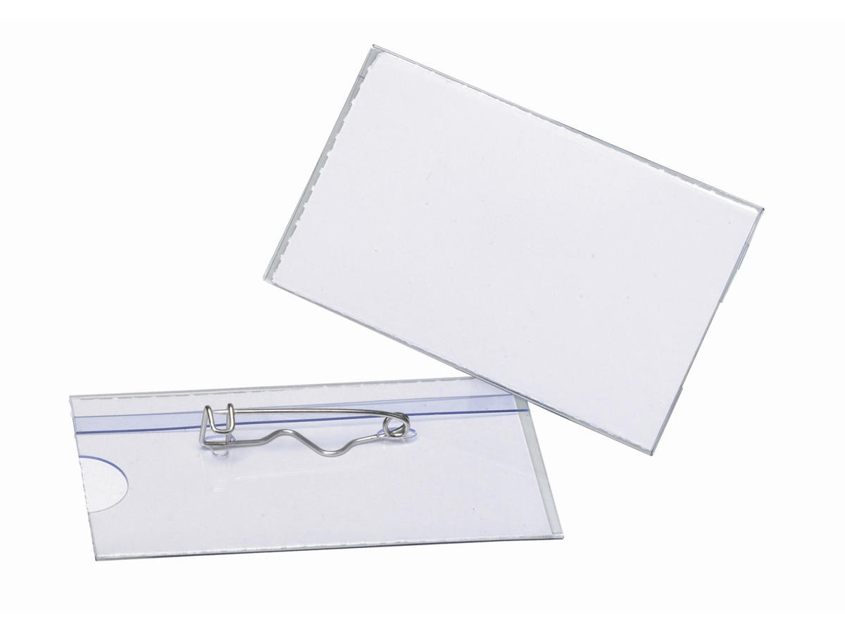 Navneskilt med indstik og nål, som man kan sættes fast på tøjet.