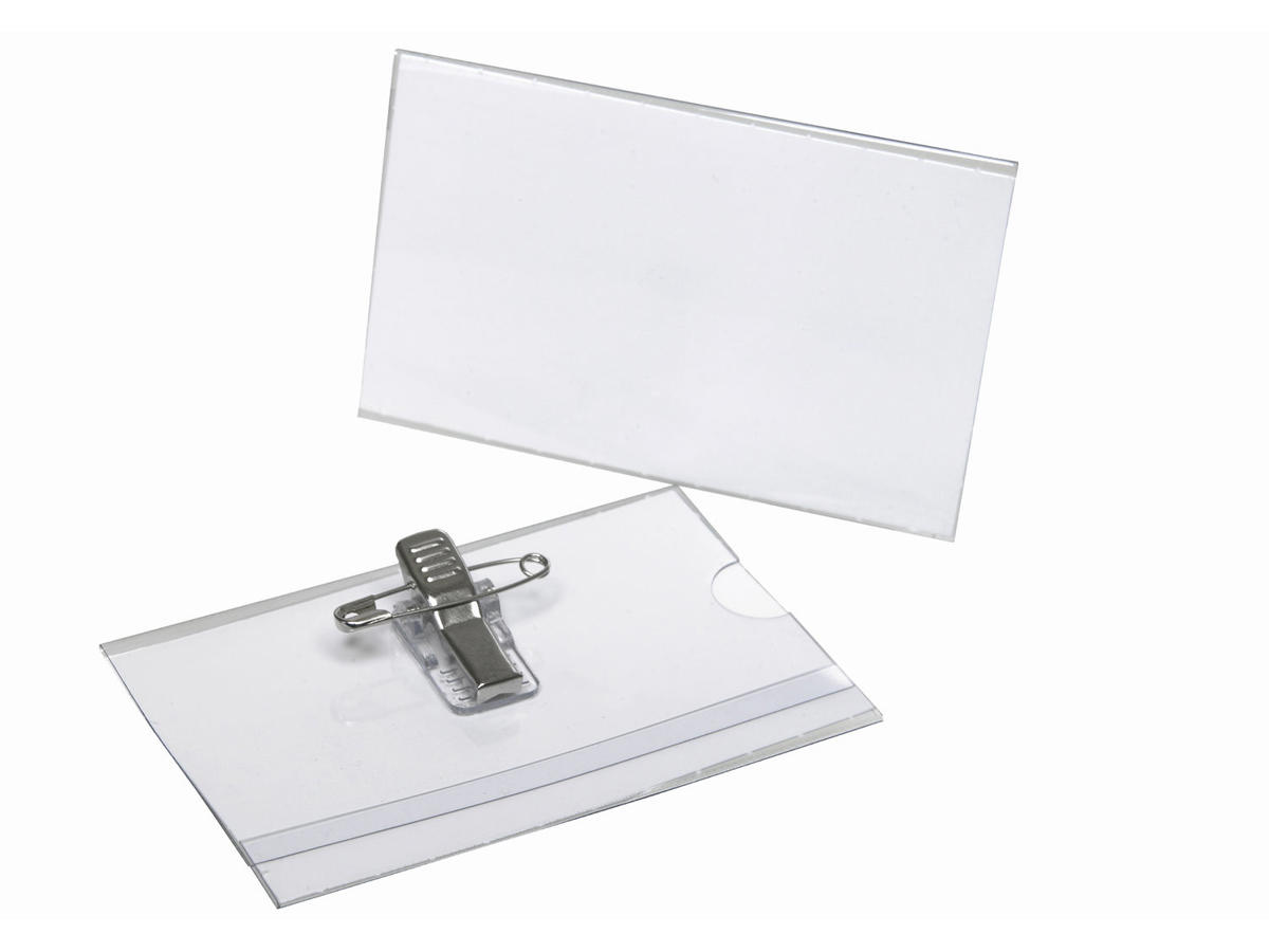 Navneskilt i klar plast med sikkerhedsnål og klemme. Med papirindlæg, lige til at printe. Passer til visitkort.