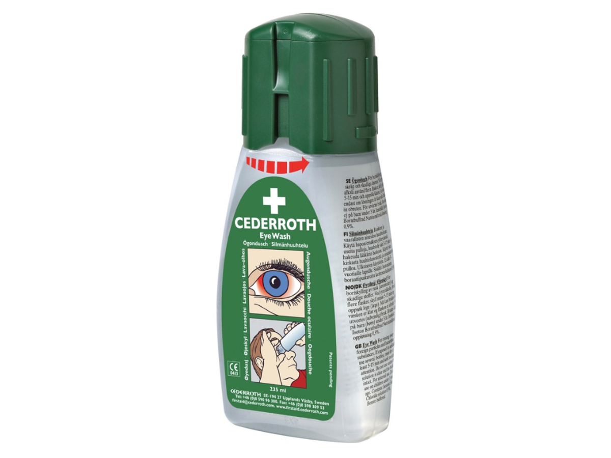 En personlig flaske med øjenskyl i lommeformat, der bekvemt kan bæres i lommen eller i det tilhørende hylster. På den måde er den hurtigt lige ved hånden, hvis der sker et uheld.
