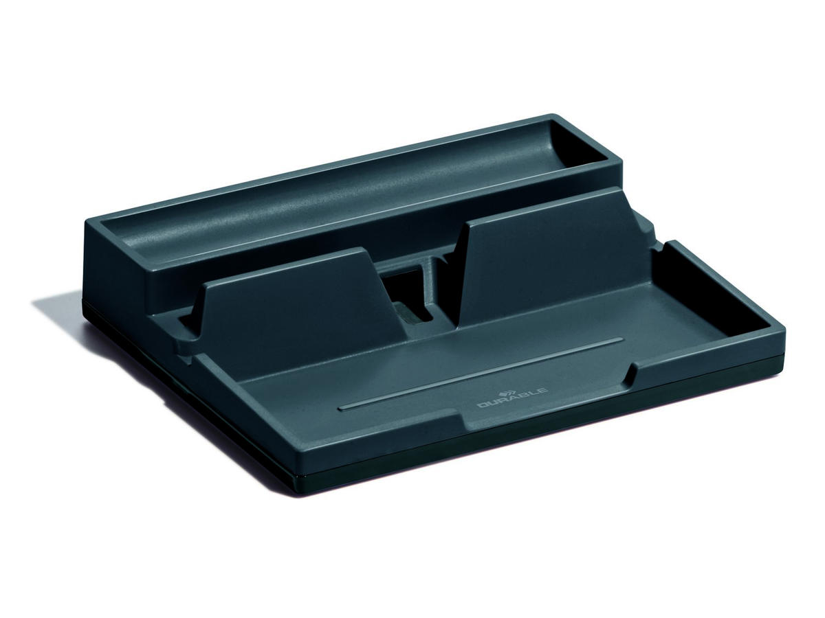 Opbevaringsskuffe til skrivebordet eller skuffe med to store opbevaringsrum. Integreret holder til tablet og smartphone, samt skjult kabelbakke. Passer til VARICOLOR® Skuffeboks. Skridsikre gummifødder på undersiden. Mål 50 x 190 x 240 mm (HxBxD)