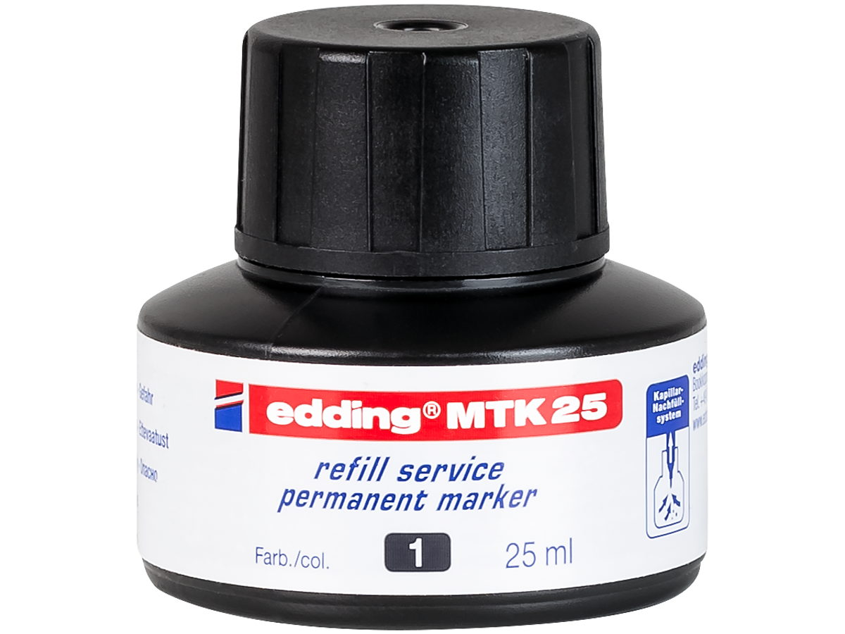 Den sorte refill-ink er specielt designet til din Permanent edding-tusch. Denne blæk er af høj kvalitet og sikrer, at din marker stadig skriver klart og uden udtværing - selv efter flere genopfyldninger.