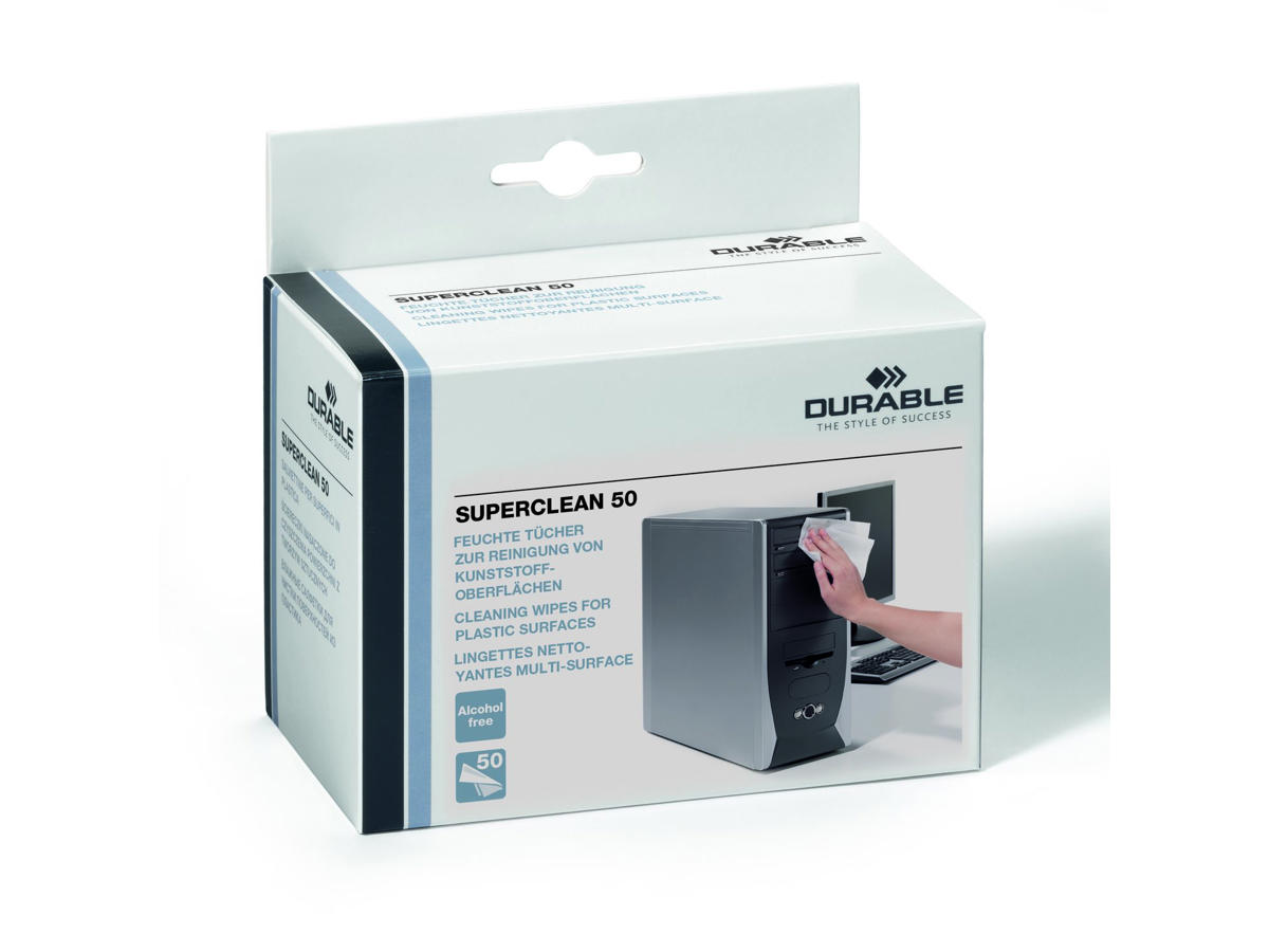 50 stk. fugtige individuelt pakket renseservietter SUPERCLEAN til rengøring af plastoverflader såsom udvendige overflader af computere, printere, telefoner og andet kontorudstyr. Har antistatisk virkning, er uden alkohol og er bionedbrydelig.