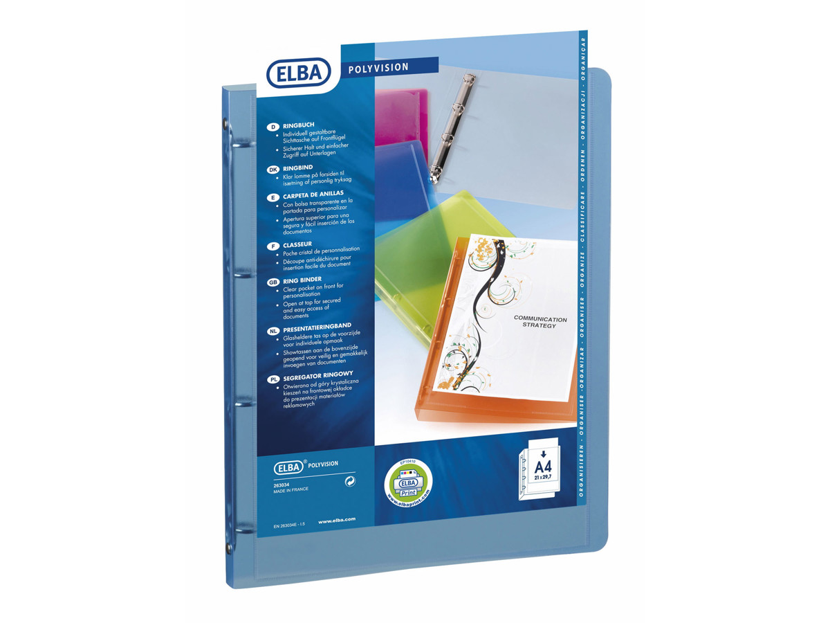 Smart ringbind fremstillet i transparent, farvet PP-folie med klar lomme på forsiden. Tilpasses nemt og hurtigt med personlig forside. Ideel til projekter, opgaver, præsentationer m.m.. Leveres uden rygetiket. Benyt www.elbaprint for personliggørelse.