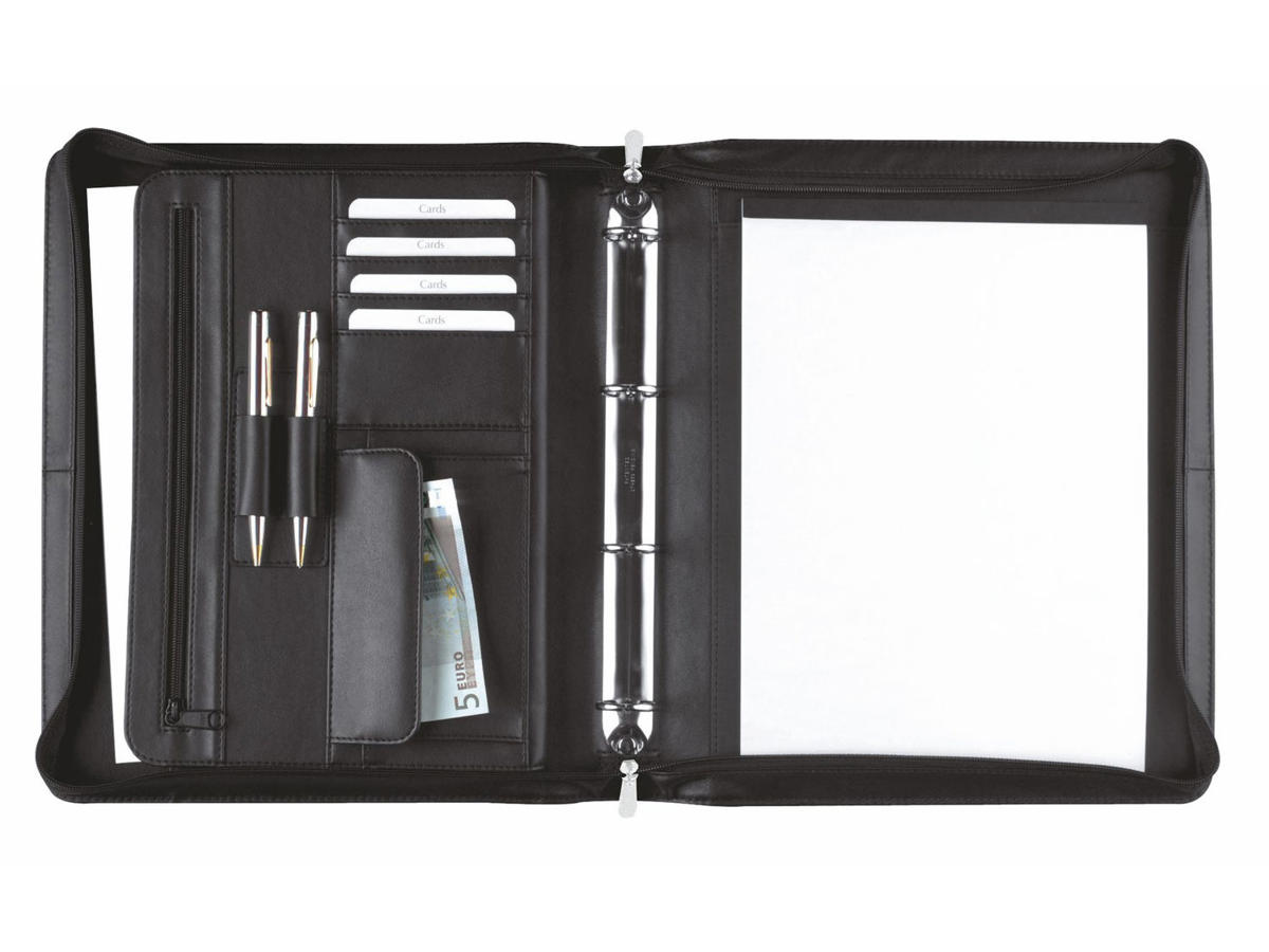 Dette EUROSTYLE Salgsmappe Skind indeholder også et ringbindsmekanisme og en indvendig lille lomme til penge, nøgler og andre små genstande. Med den indbyggede lynlås kan du nemt og sikkert lukke mappen og holde dine ejendele sikre.