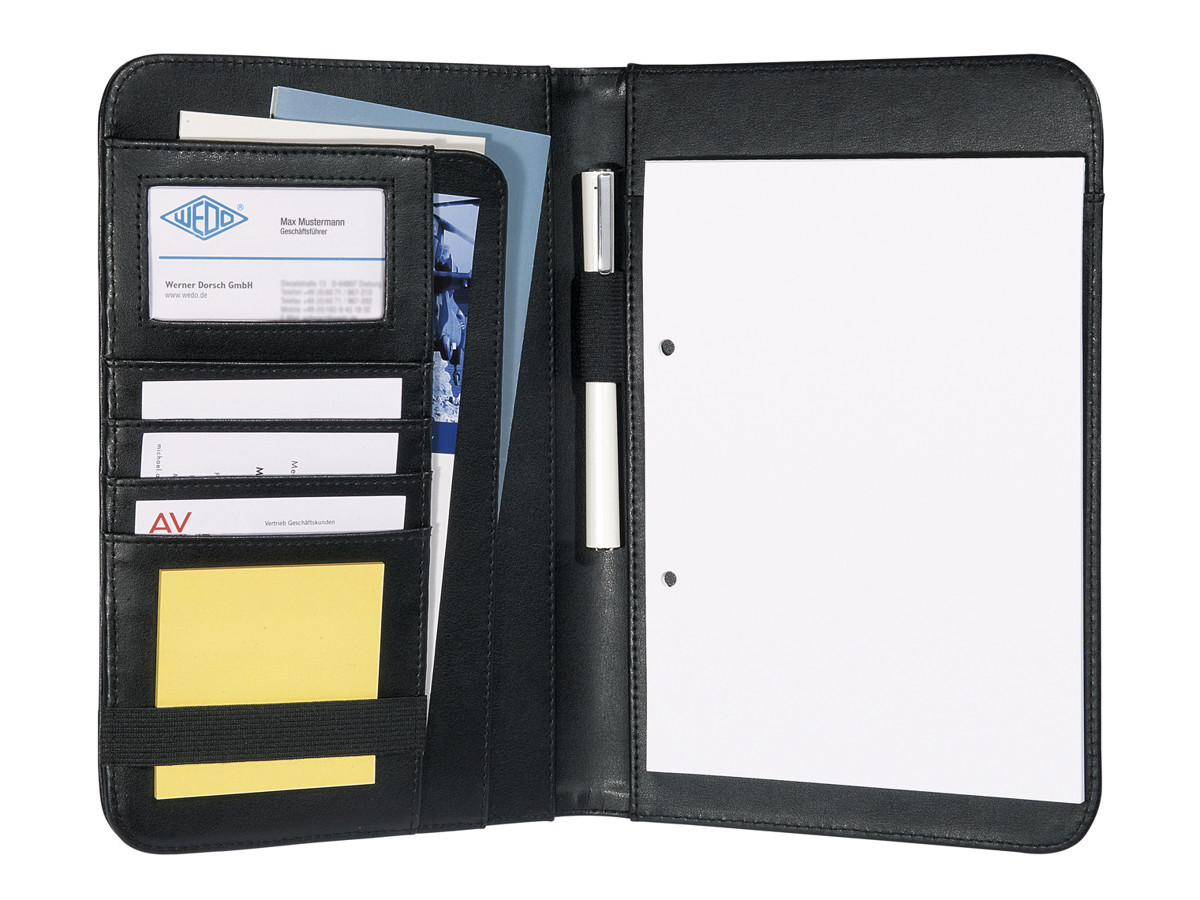 Konference mappe A5, 2 A5 lommer og penne holder. 8 lommer til visitkort eller kreditkort. Sort, soft læder-look. Leveres i 4-farvet gaveæske.