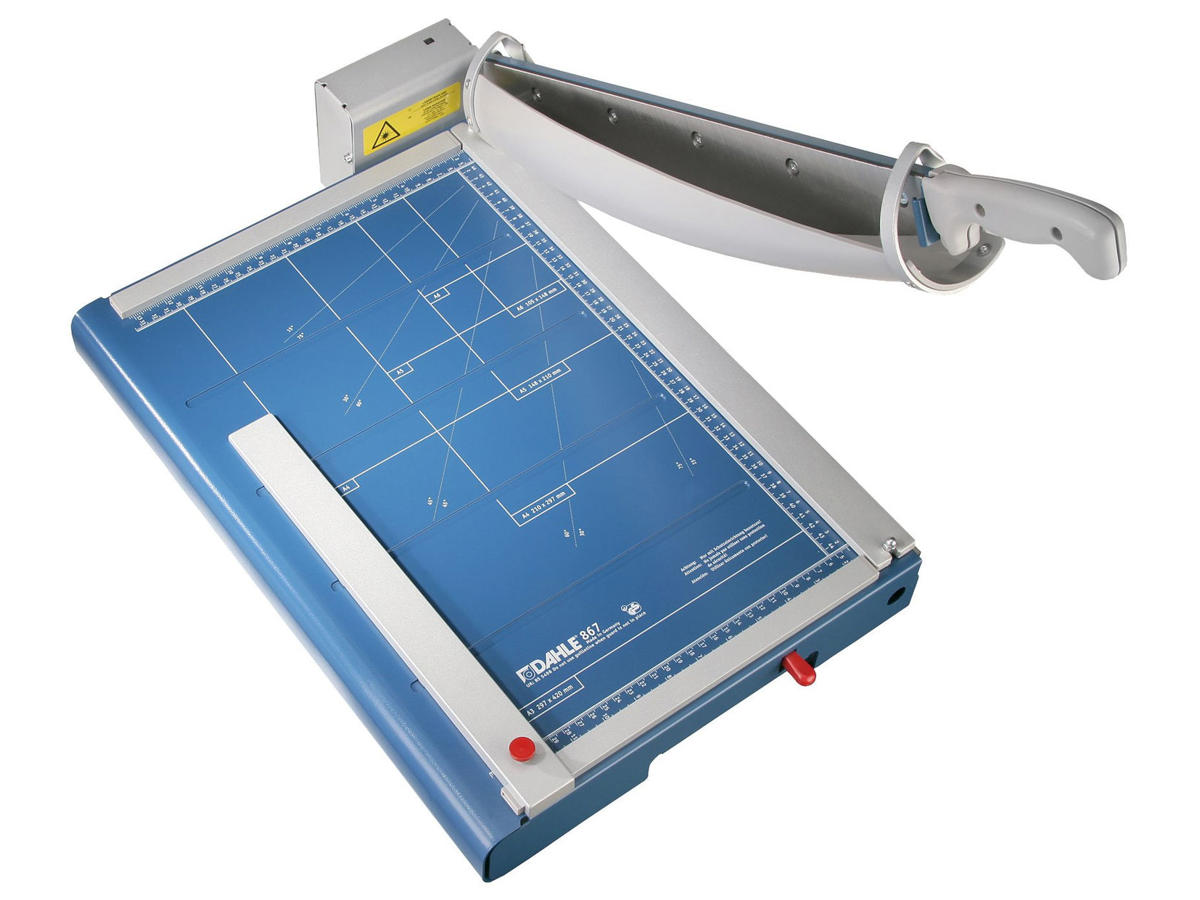 Anlægsbord: 513x365 mm - 20 måleenheder med angivelse af cm og mm. Skærehøjde 3,5mm - svarende til ca. 35 ark. Monteret med under- og overkniv. Automatisk pressebalk, anlægsvinkel samt sikkerhedsautomatik.