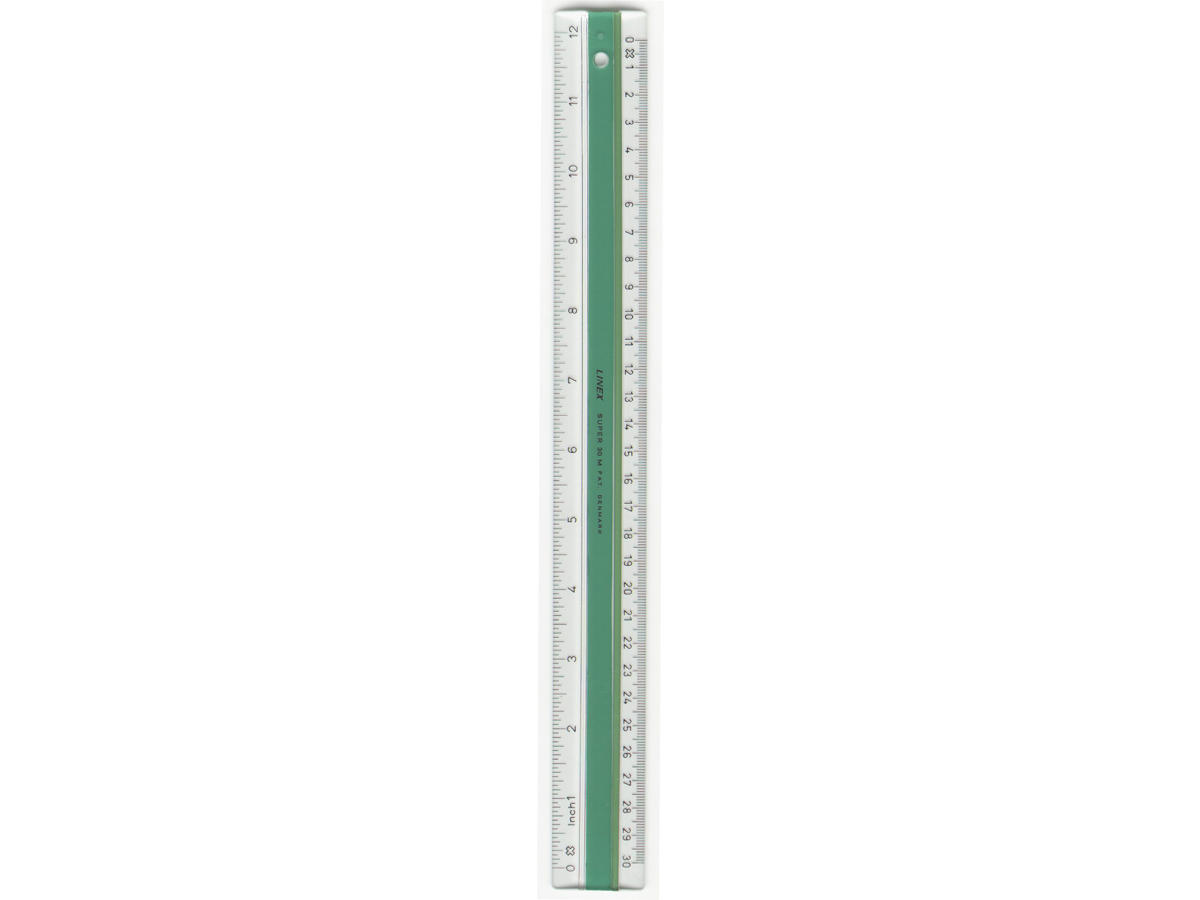 Fremstillet af krystalklar acryl med grønt midterparti. Med 2 facetter. Gummiskinnen på bagsiden forhindrer linealen i at skride på papiret.