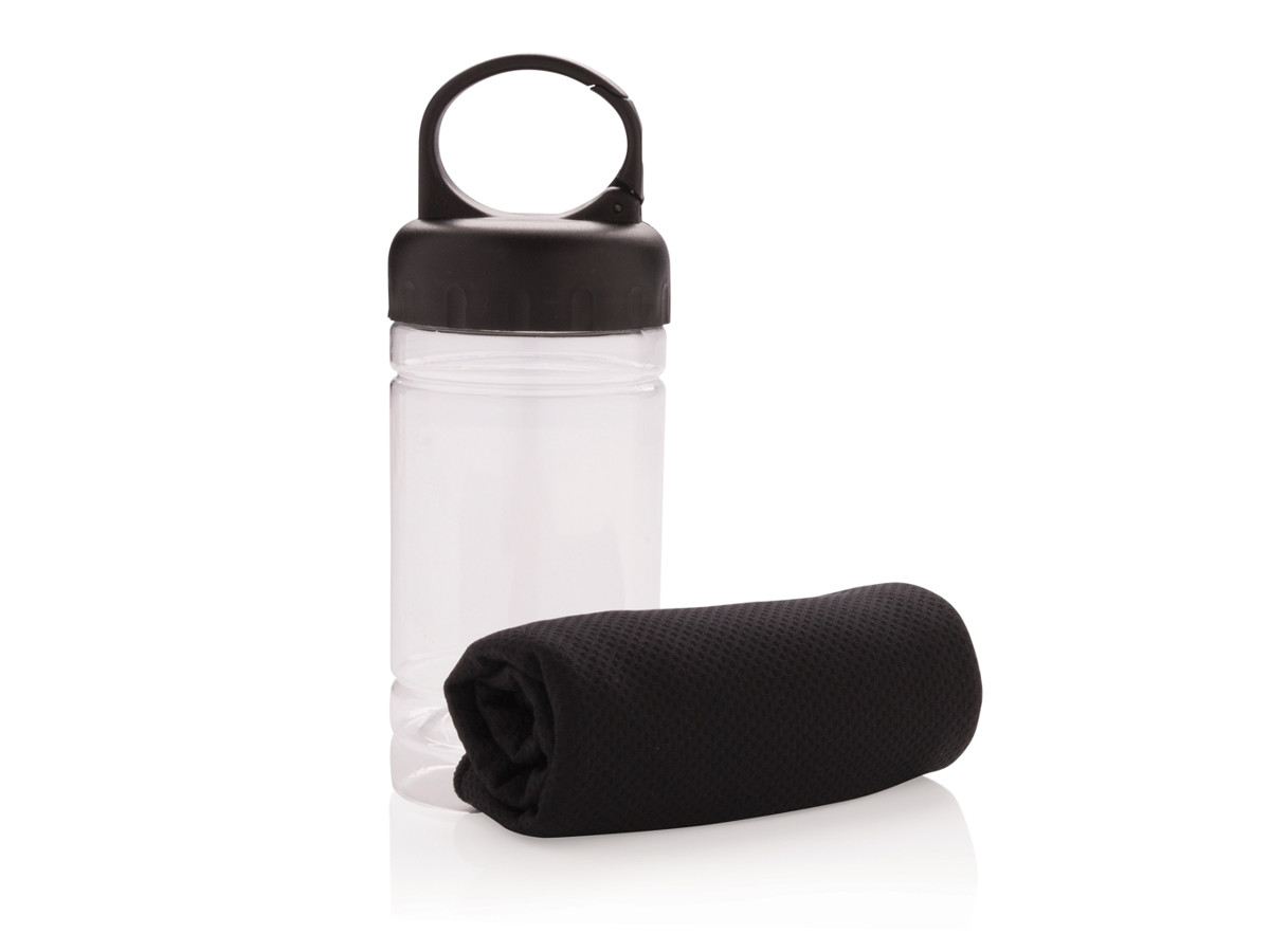 Kølende mikrofiber håndklæde, 100% fri for kemikalier. 98% solblokker funktion og op til UV 50+ beskyttelse. Dette håndklæde kan påføres koldt vand og derefter anvendes som afkølende og forfriskende. Flasken er lavet af PP materiale med låg af ABS plast med karabinhage , nem at tage med overalt til dine udendørsaktiviteter.