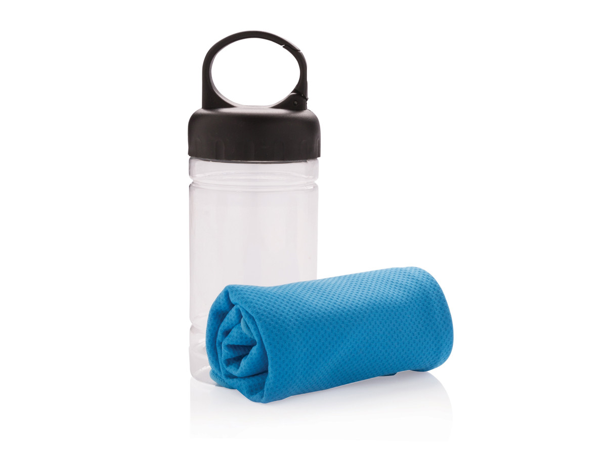 Kølende mikrofiber håndklæde, 100% fri for kemikalier. 98% solblokker funktion og op til UV 50+ beskyttelse. Dette håndklæde kan påføres koldt vand og derefter anvendes som afkølende og forfriskende. Flasken er lavet af PP materiale med låg af ABS plast med karabinhage , nem at tage med overalt til dine udendørsaktiviteter.