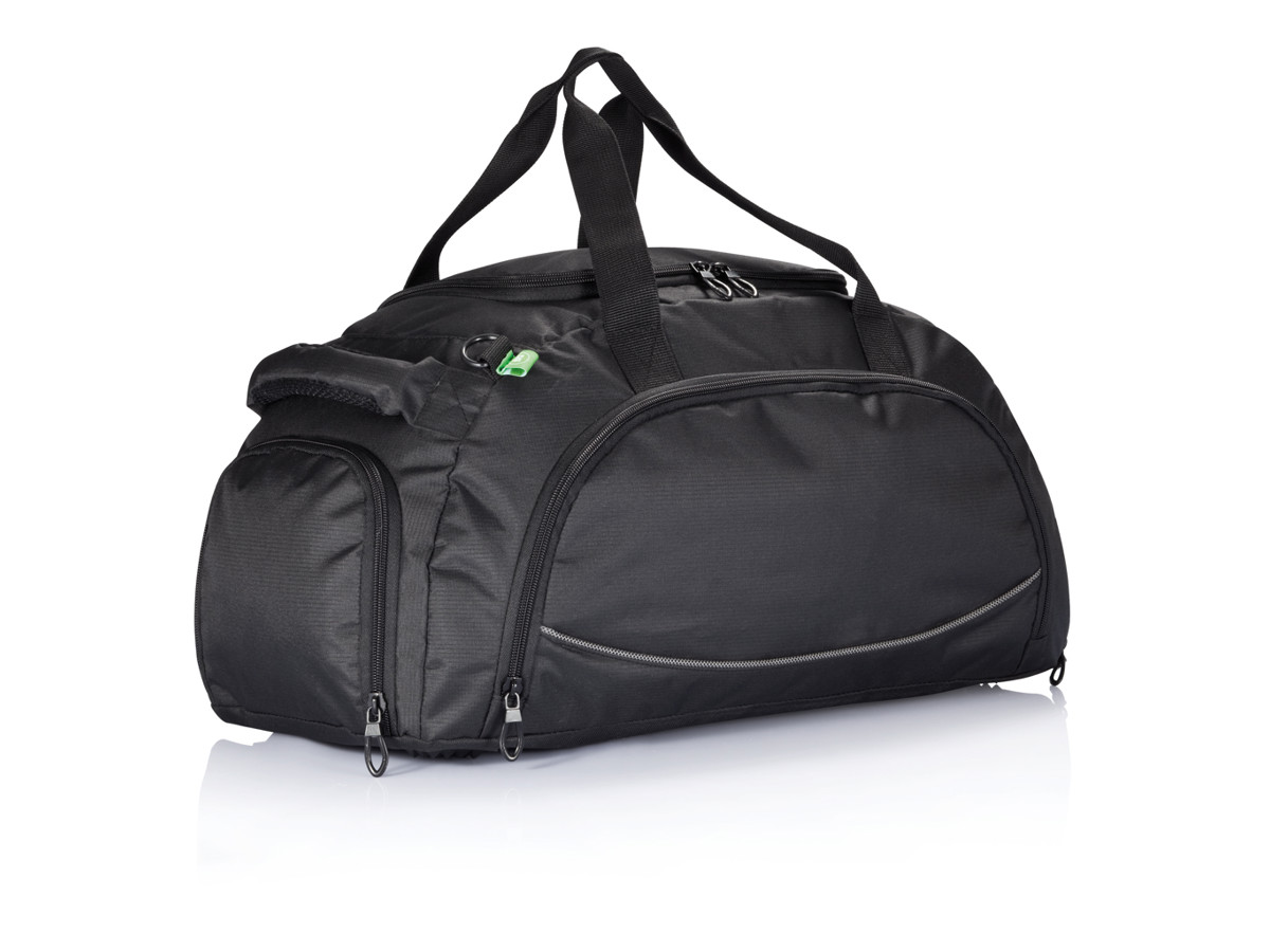 600D ribstop, lynlås lomme foran med organizer, sidelomme, skorum, webbing-håndtag og skulderstrop, 4 fødder i bunden, PVC fri.