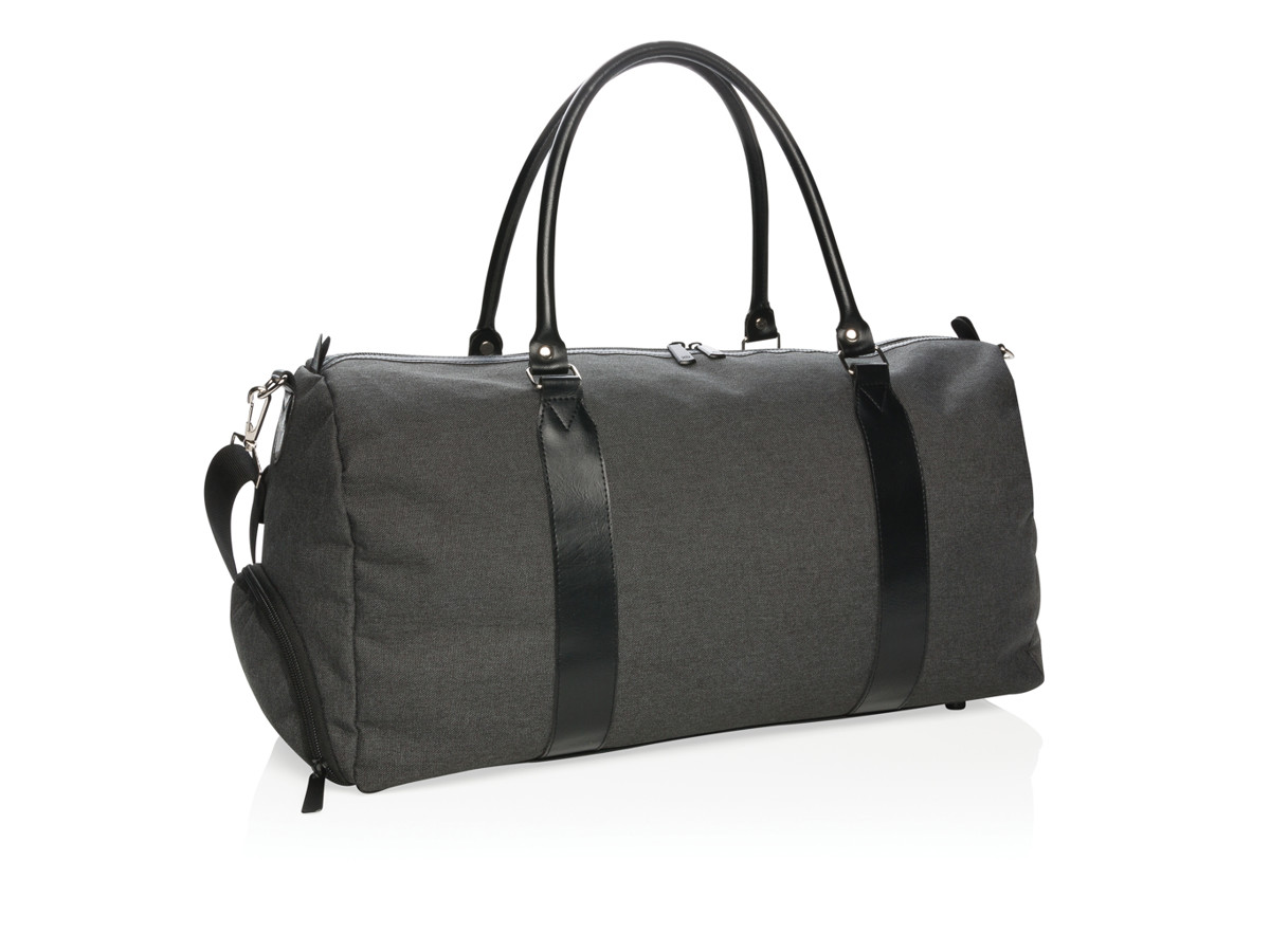 Moderne og minimalistisk 600D polyester weekend taske med PU håndtag og behagelig skulderstrop. Et stort hovedrum med masser af plads til dine fornødenheder og sportsudstyr. Forbind nemt din powerbank til det integrerede USB ladestik og oplad din telefon eller tablet på farten. Lomme til hurtig adgang. PVC fri.