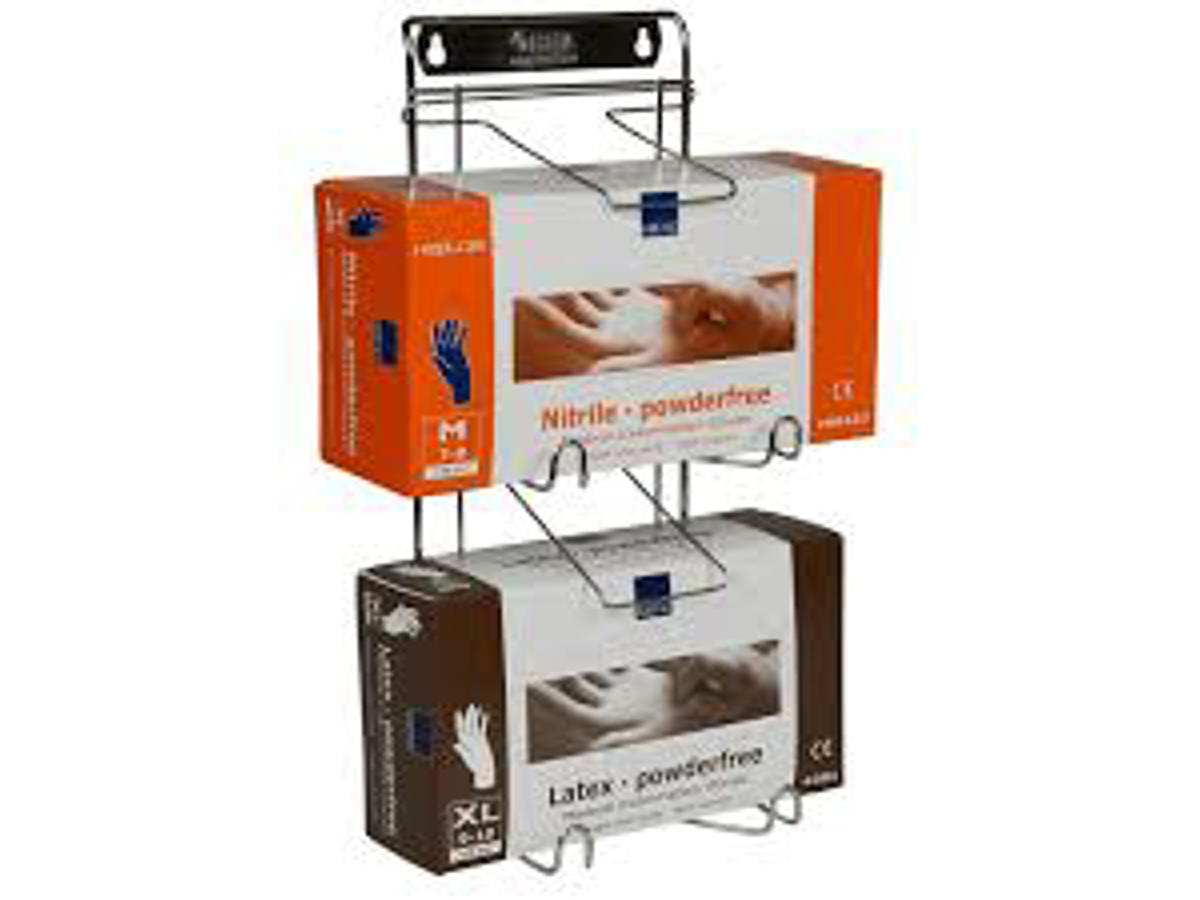 Abena Flexi Rack er en vægholder rustfrit stål til handskeæsker. Denne vægholder kan holde 2 æsker. Stativet passer til også til ansigtsservietter og andre genstande som findes i æske dispensere.