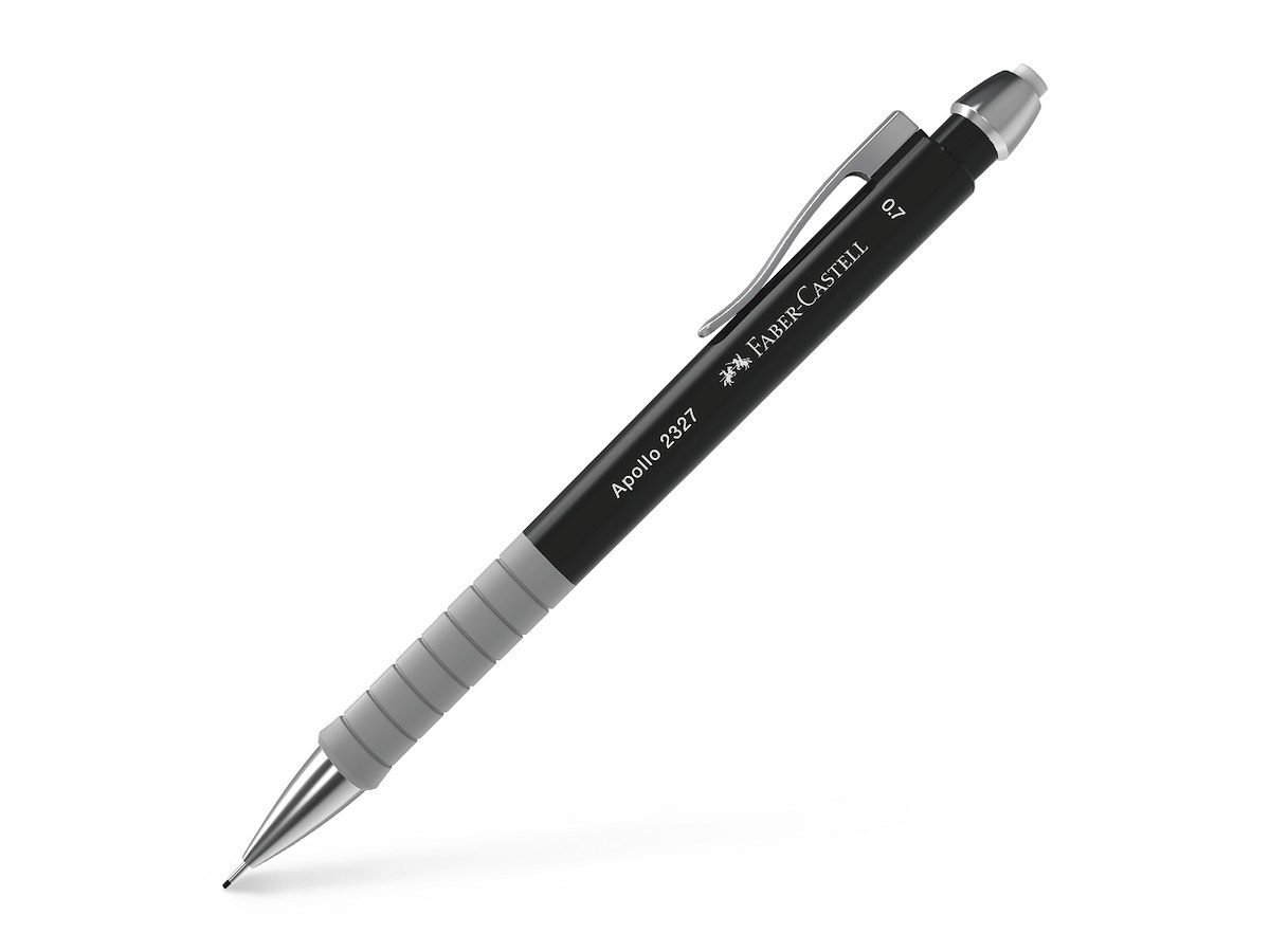 Den mekaniske blyant Apollo garanterer med sin ergonomiske grebzone en behagelig skriveoplevelse. Takket være den polstrede mine er den godt beskyttet mod brud. Desuden er hylsteret på Apollo fuldt optrækkeligt, så det ikke laver huller i din lomme. Der er to forskellige stregbredder til rådighed: 0,7 mm bly til ekstra brudsikker skrivning eller 0,5 mm bly til fin skrivning. Detaljeret beskrivelse Den moderne blyant til skrivning og skitsering Blyhylster med glidebagside Beskyttet mod brud takket være fjederbelastet bly Ergonomisk gribezone til utrættelig skrivning Med integreret viskelæder Stregbredde: 0,7 mm Farve på skaft: sort