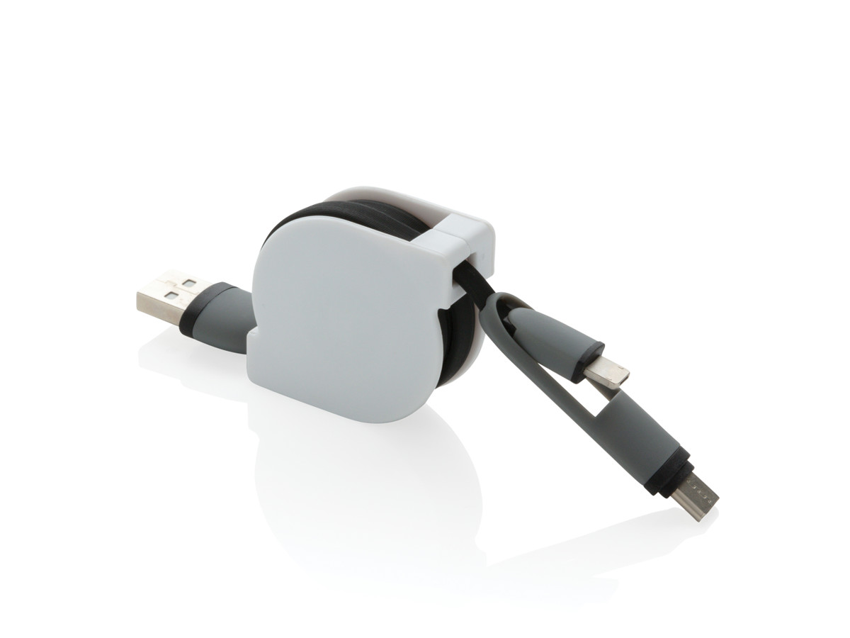 Kompakt og udtrækkeligt 3 i 1 opladningskabel med type C og dobbeltsidet stik til IOS og Android enheder, der kræver micro USB. På grund af den udtrækkelige mekanisme kan det 100 cm lange flade kabel let tages med hvor som helst hen uden at blive filtret. ABS-kasse med kabel i TPU-materiale. Også egnet til synkronisering.