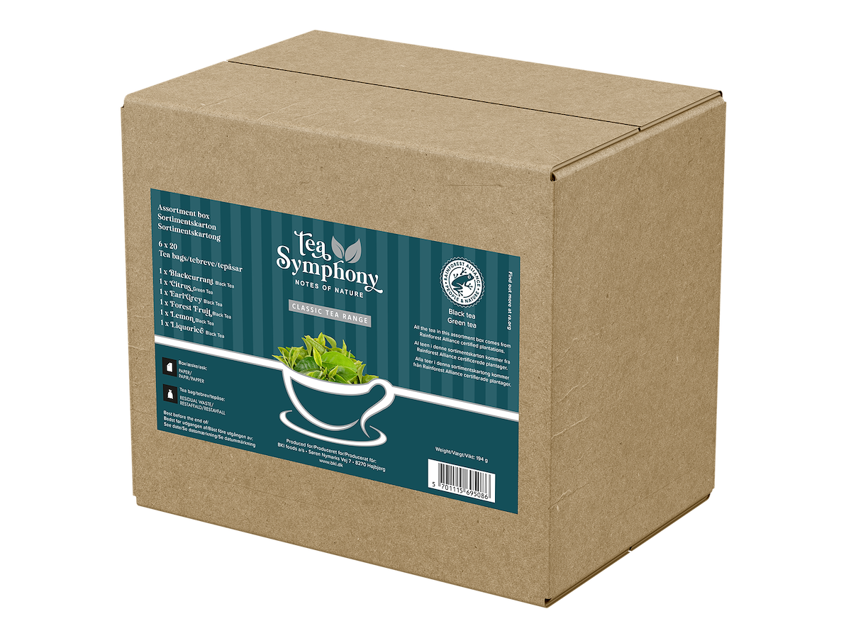 TEA SYMPHONY Mix karton med 120 tebreve giver dig nemt og bekvemt et udvalg af de seks mest populære te varianter i Danmark. Al grøn og sort te er 100% Rainforest Alliance certificeret.
